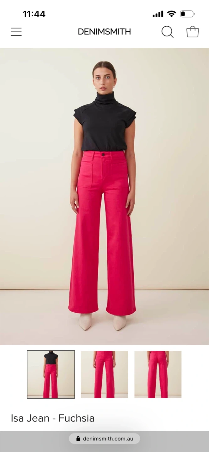 These Denimsmith Isa Jeans are a vibrant fuchsia colour. They're a high-waisted, wide-leg style. Made in Australia. European Denim, stretch half a size!