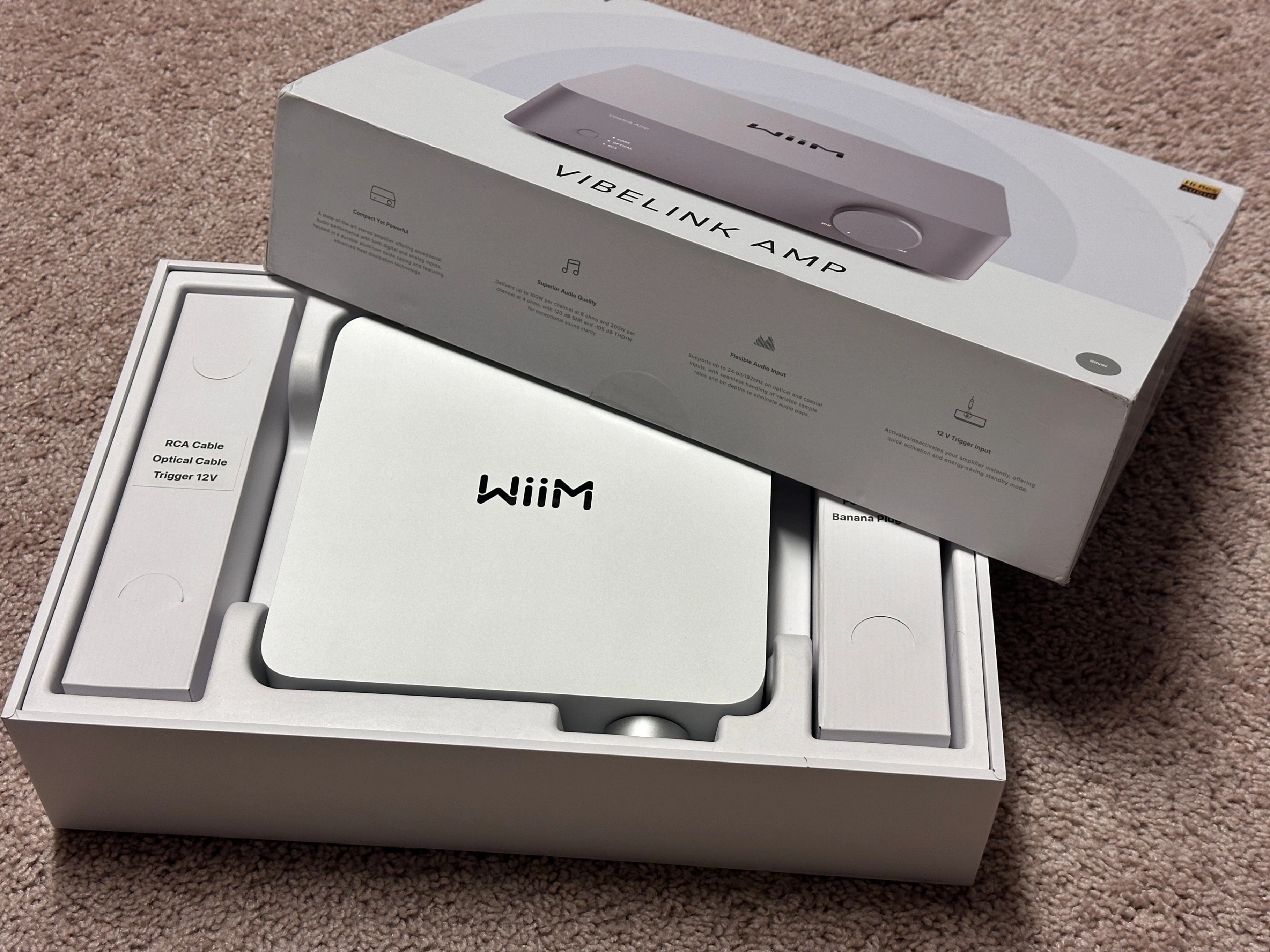 WiiM Vibelink Amp | 100W Power Amplifier with Premium ESS 9039Q2M DAC and TI TPA3255 | Compatible with WiiM Mini, Pro, Pro Plus, and Ultra | RCA, Coax, and Optical Inputs | Silver