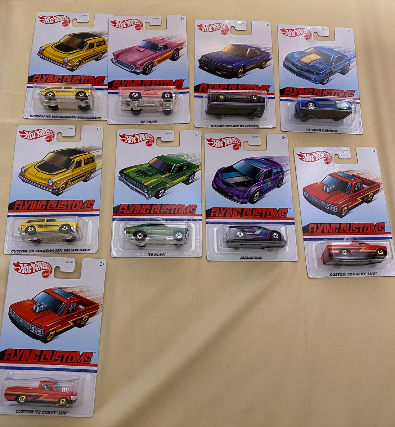 9 Hot Wheels Flying Customs die-cast cars. Includes '69 Volkswagen Squareback, '57 T-Bird, Nissan Skyline RS, '13 Copo Camaro, '68 Nova, Audacious, and '72 Chevy LUV. $8 each when you buy all 9 cars