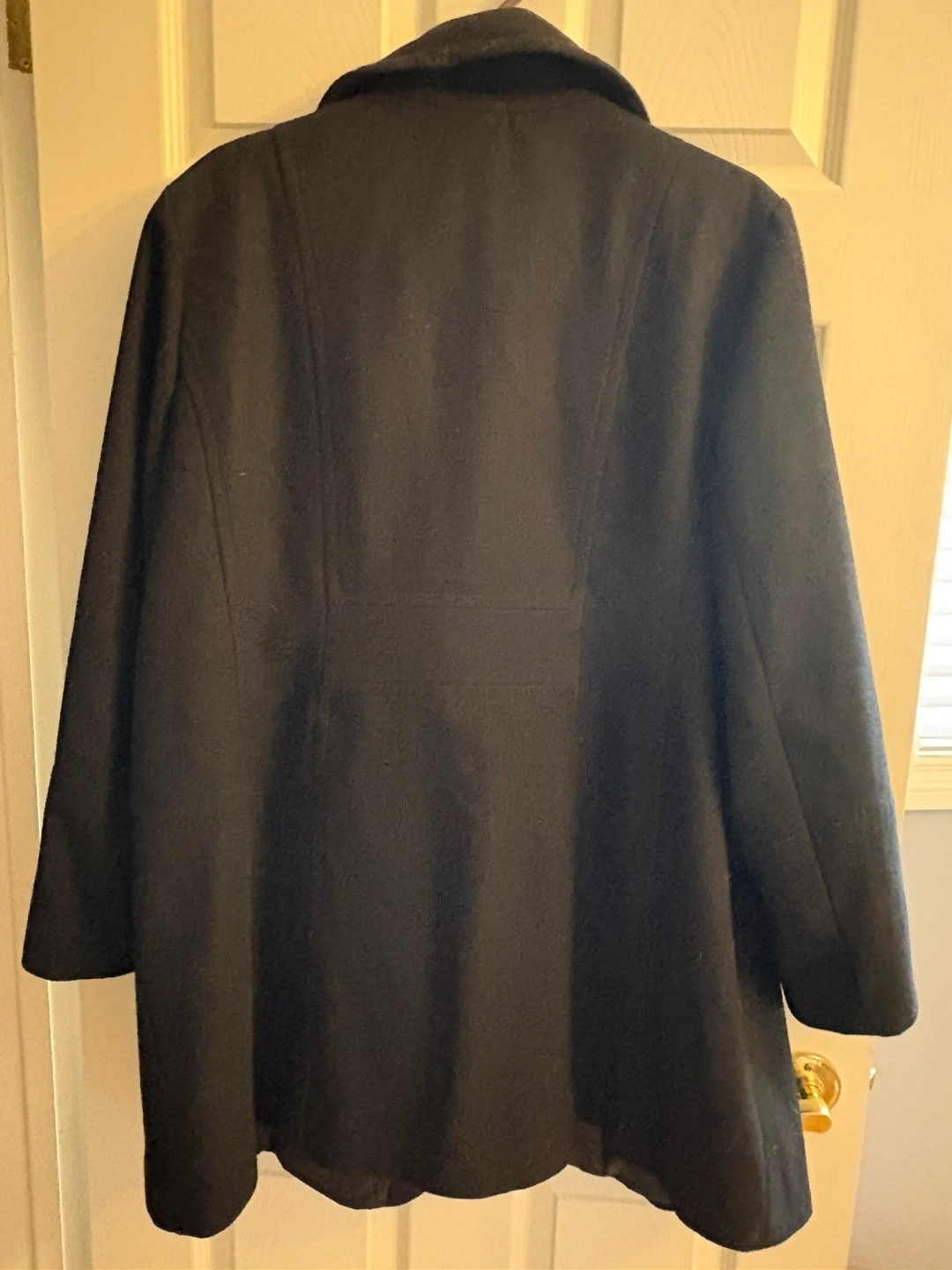 Anne Klein women's black wool blend coat. This stylish coat features a button-up front and a classic collar. It's perfect for cooler weather!