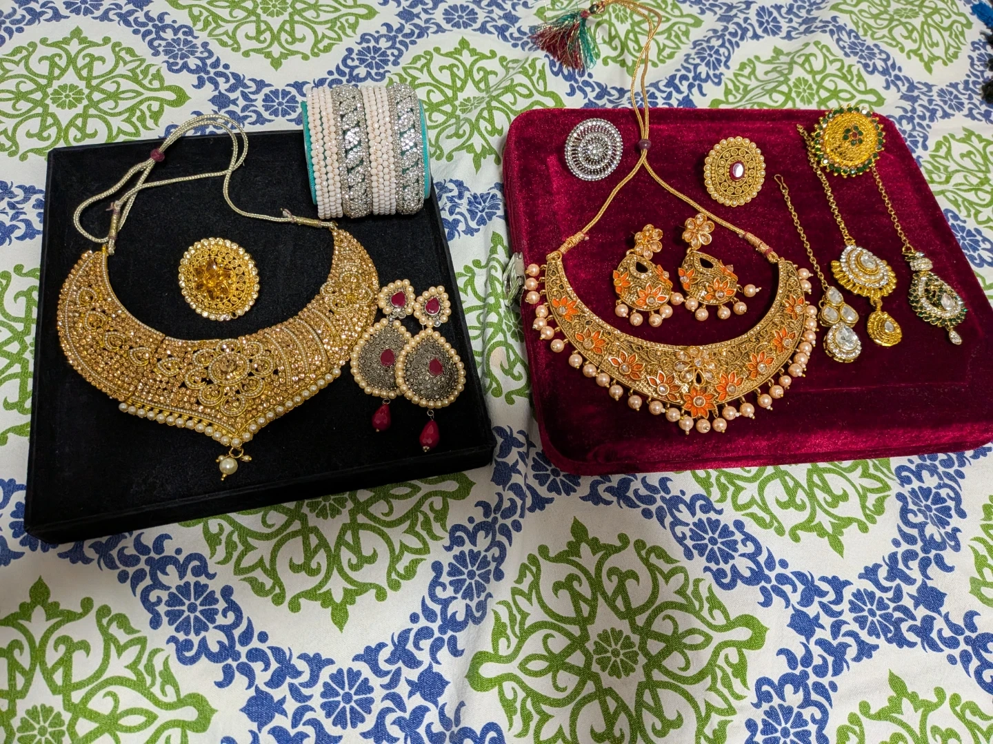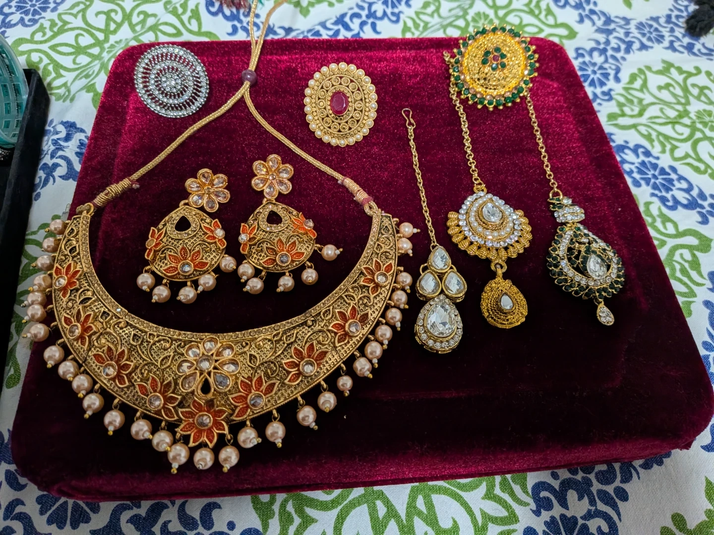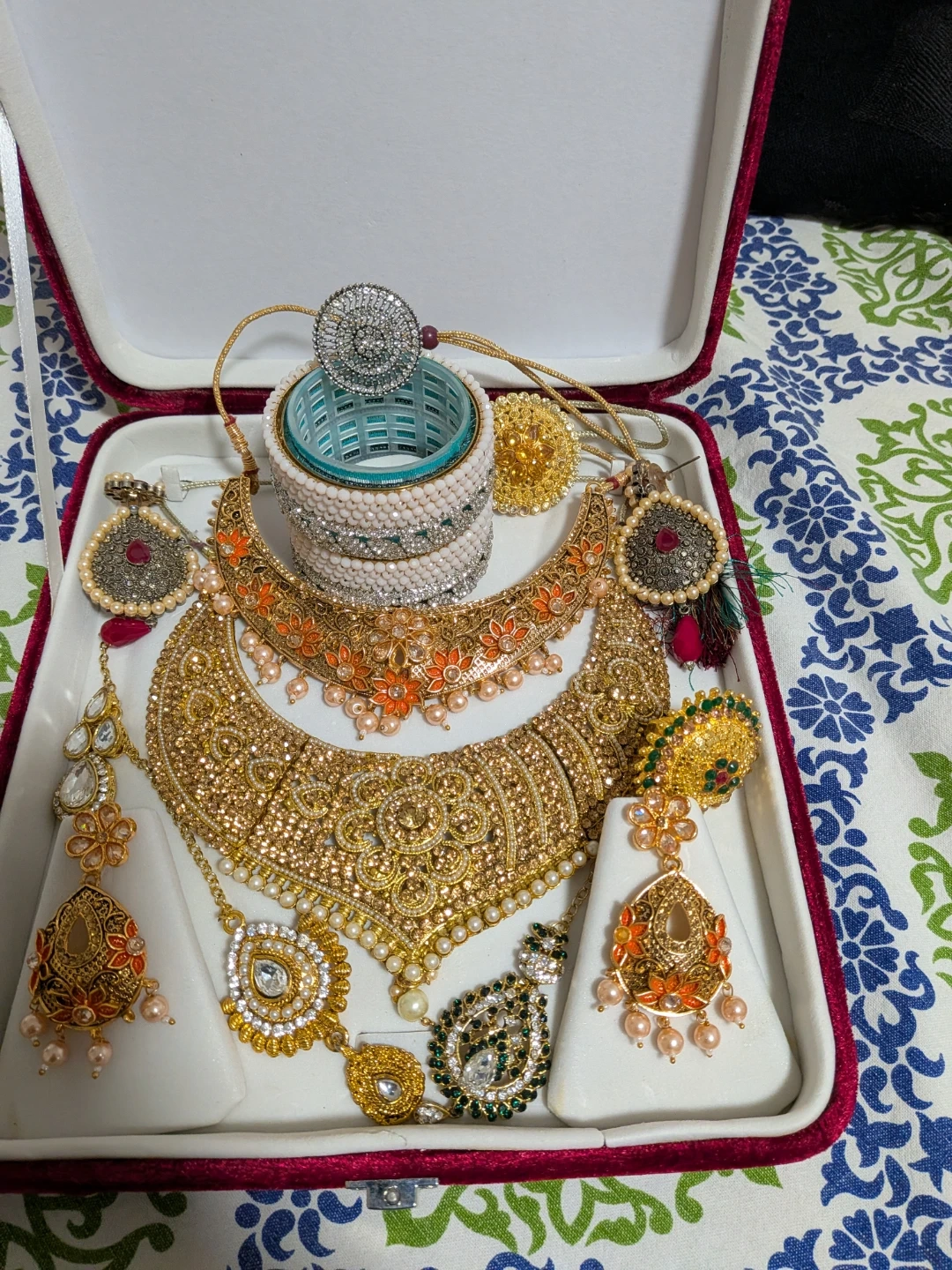 Beautiful Pakistani bridal jewelry sets in excellent condition! These sets include necklaces, earrings, rings, and bangles. Perfect for weddings or special occasions!