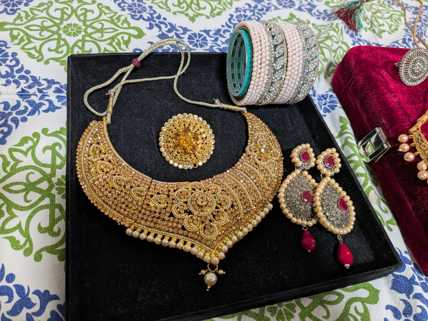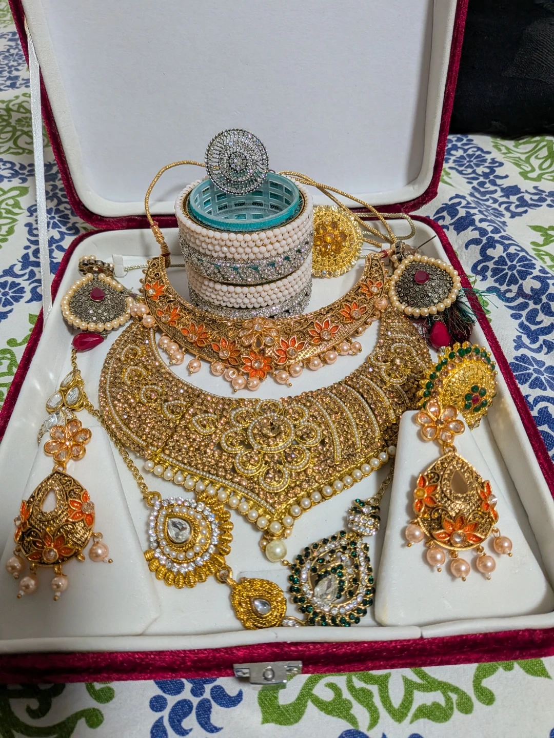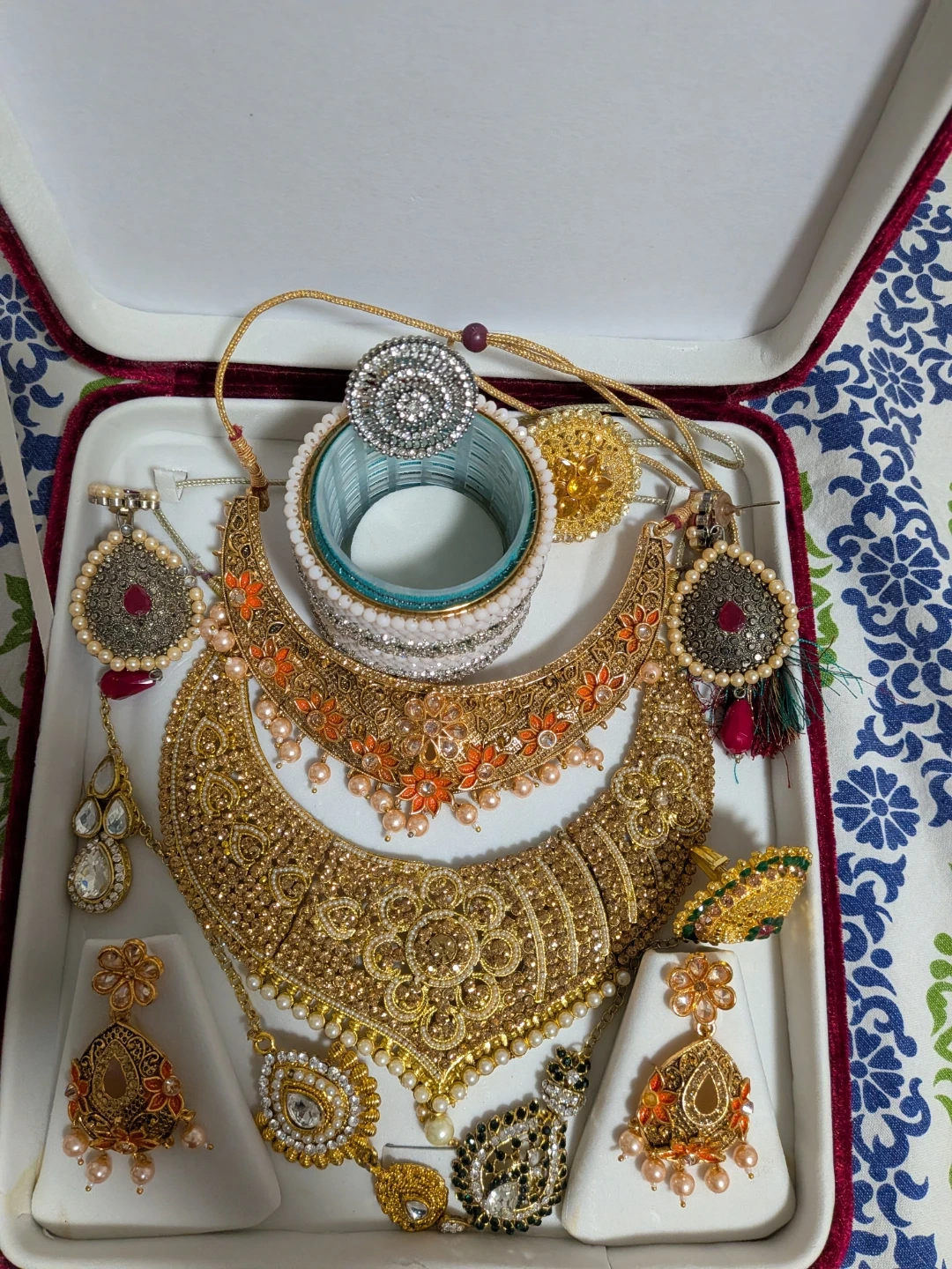 Beautiful Pakistani bridal jewelry sets in excellent condition! These sets include necklaces, earrings, rings, and bangles. Perfect for weddings or special occasions!