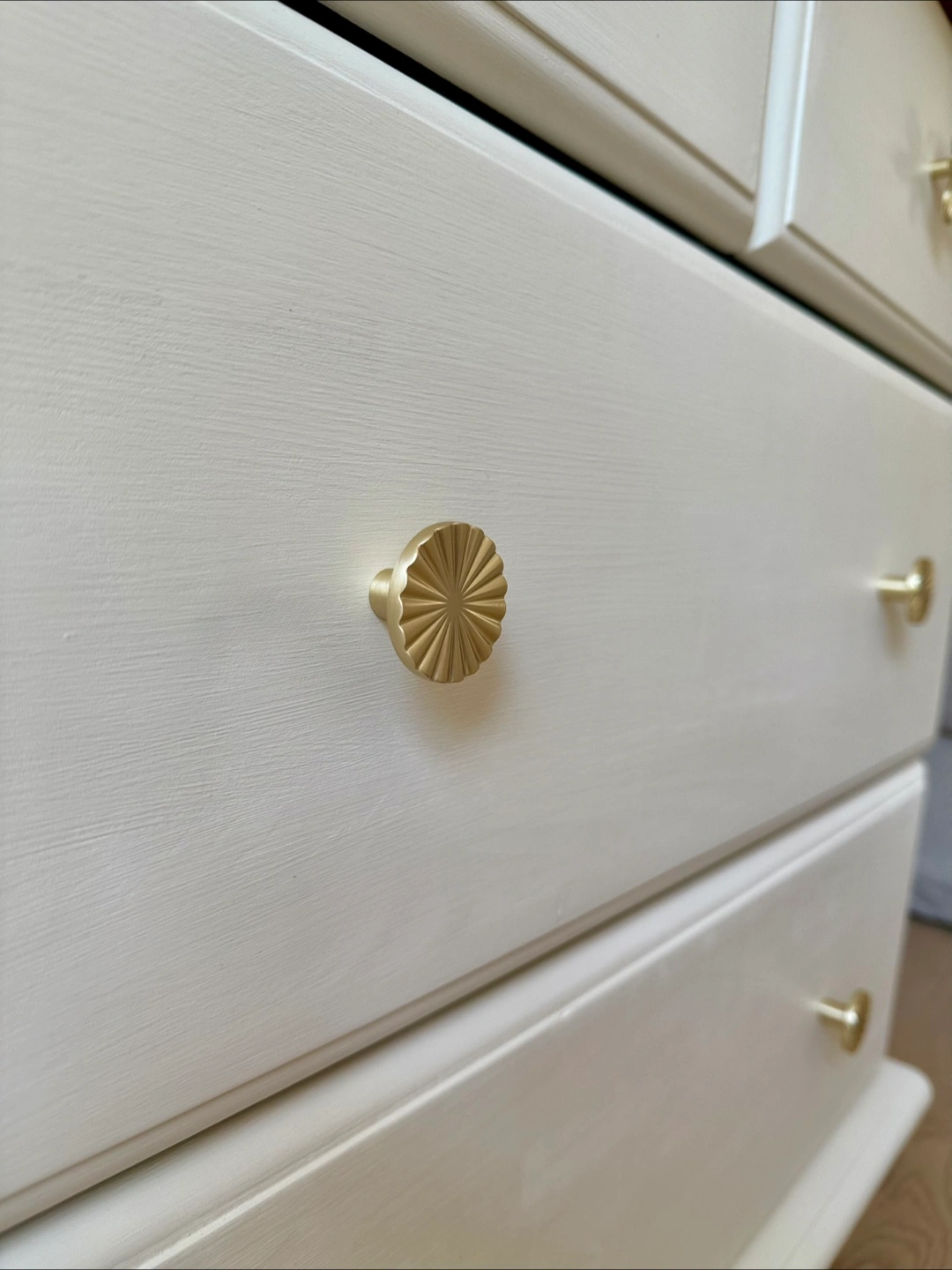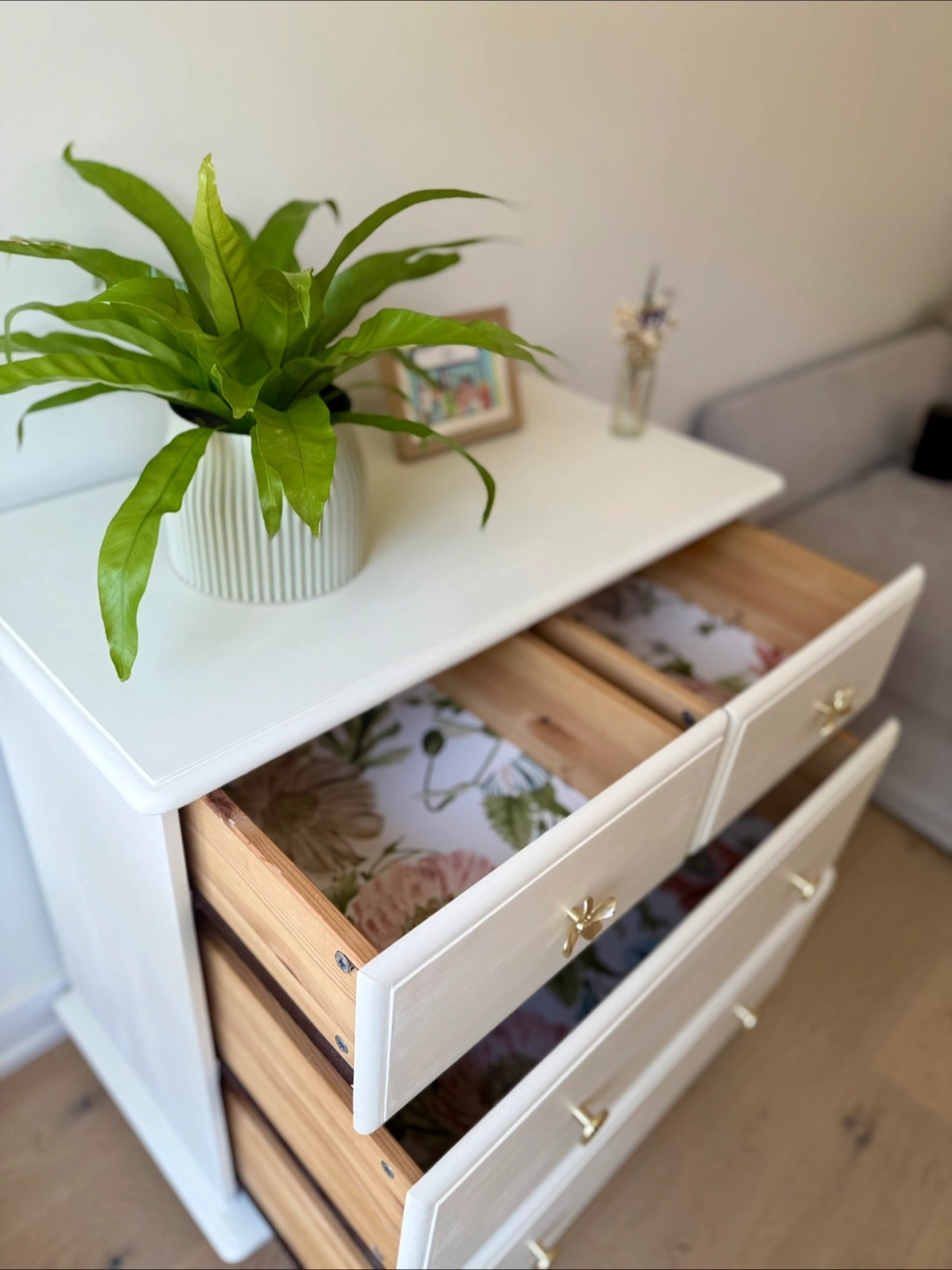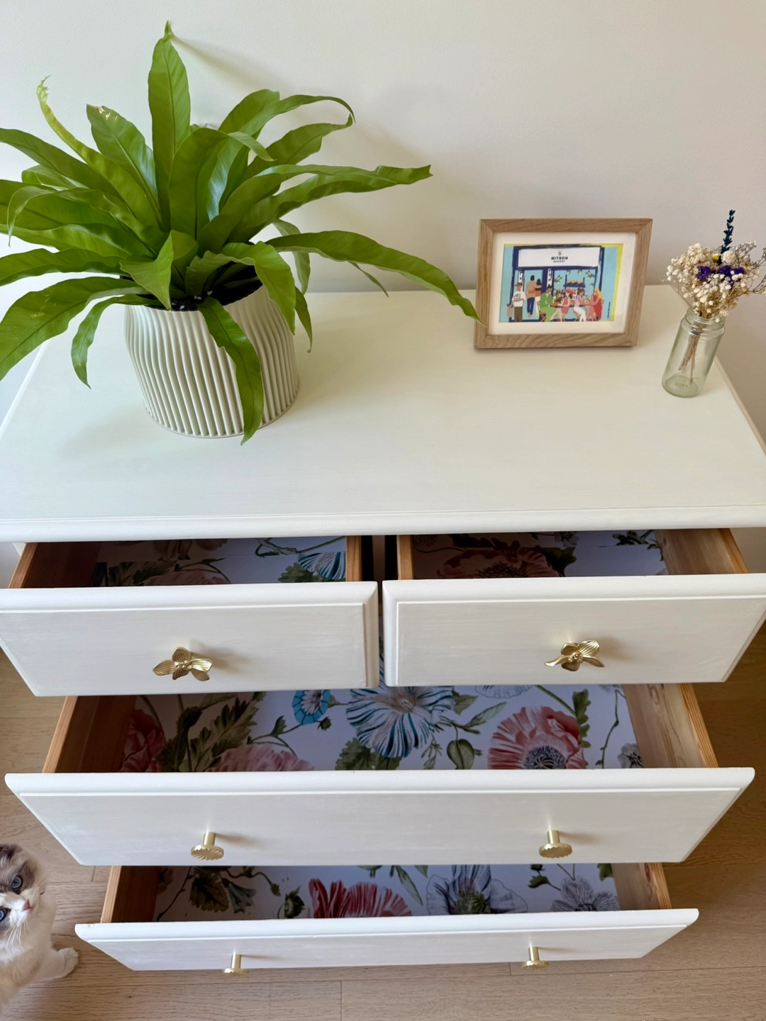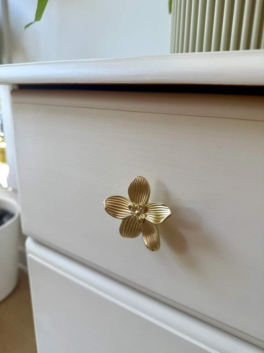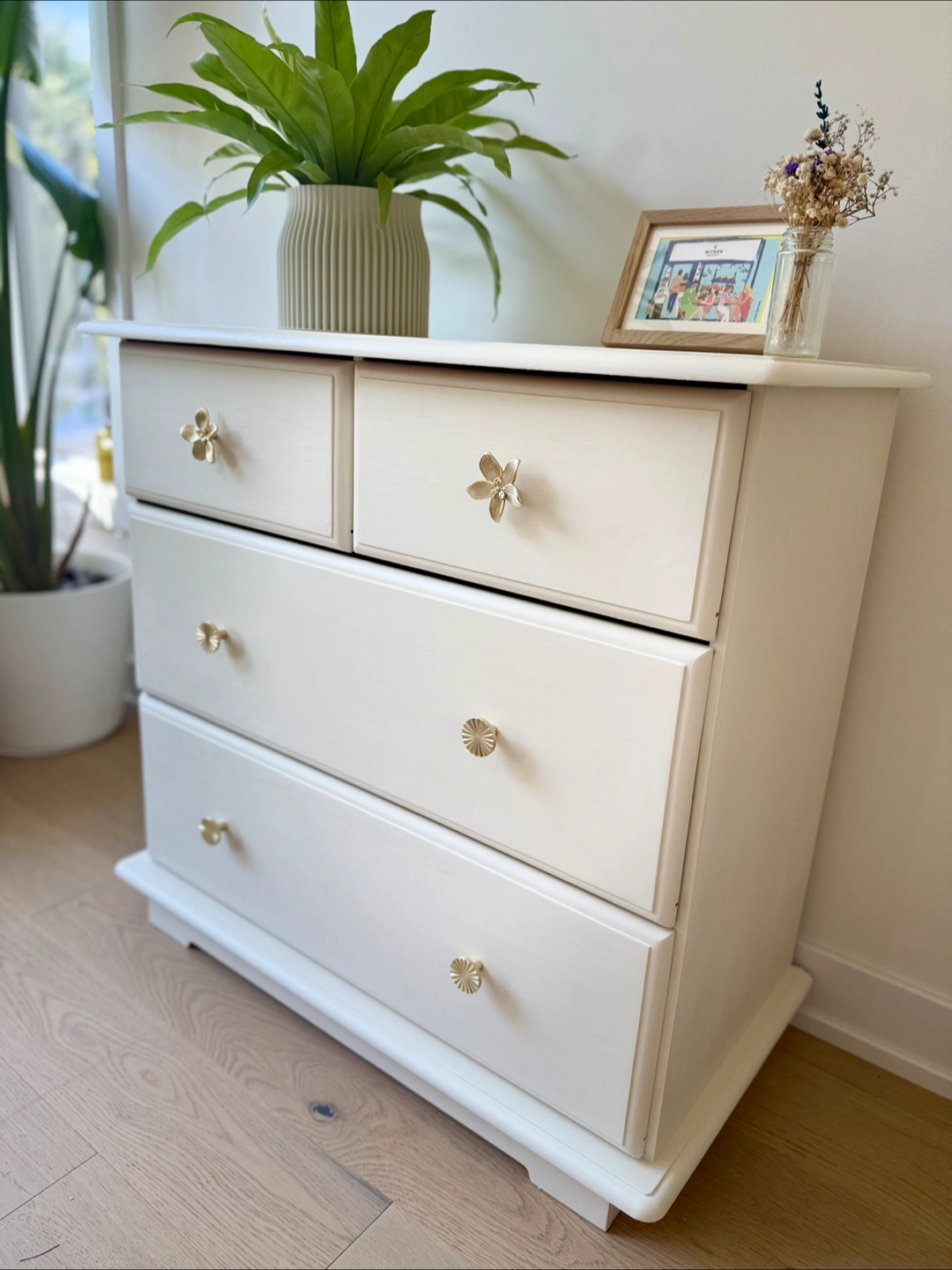 Selling a lovely white dresser with unique gold flower knobs! It features four spacious drawers, perfect for organizing your clothes and belongings. The interior of the drawers are lined with a pretty floral pattern. It's in great condition and would add a touch of elegance to any room