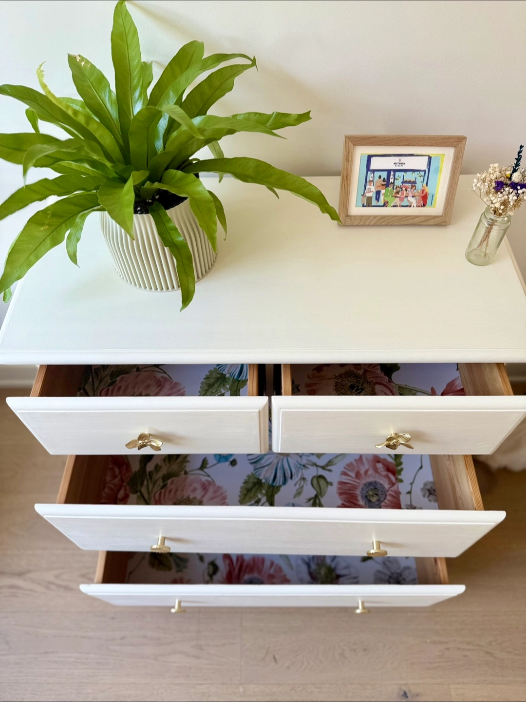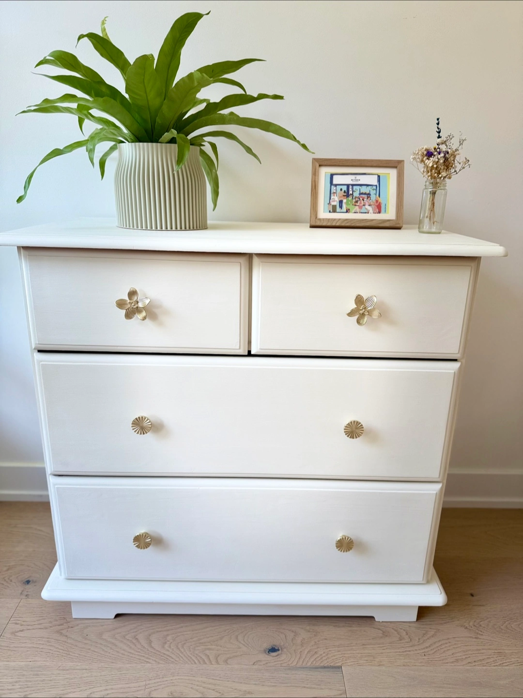 Selling a lovely white dresser with unique gold flower knobs! It features four spacious drawers, perfect for organizing your clothes and belongings. The interior of the drawers are lined with a pretty floral pattern. It's in great condition and would add a touch of elegance to any room