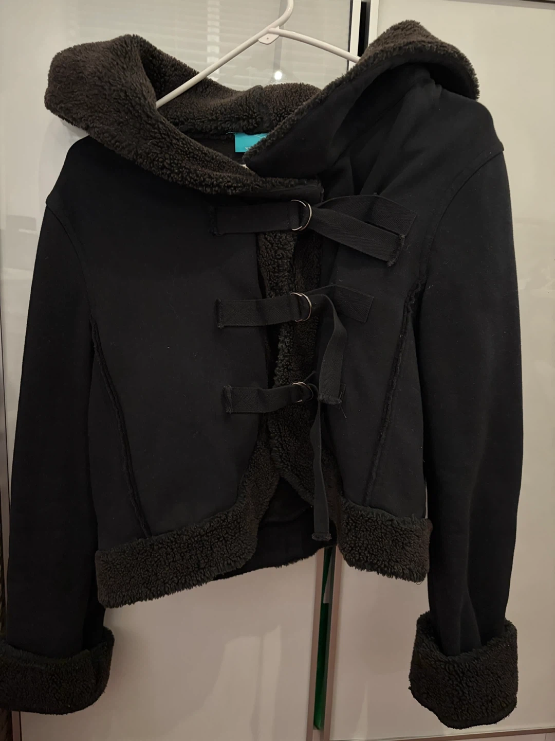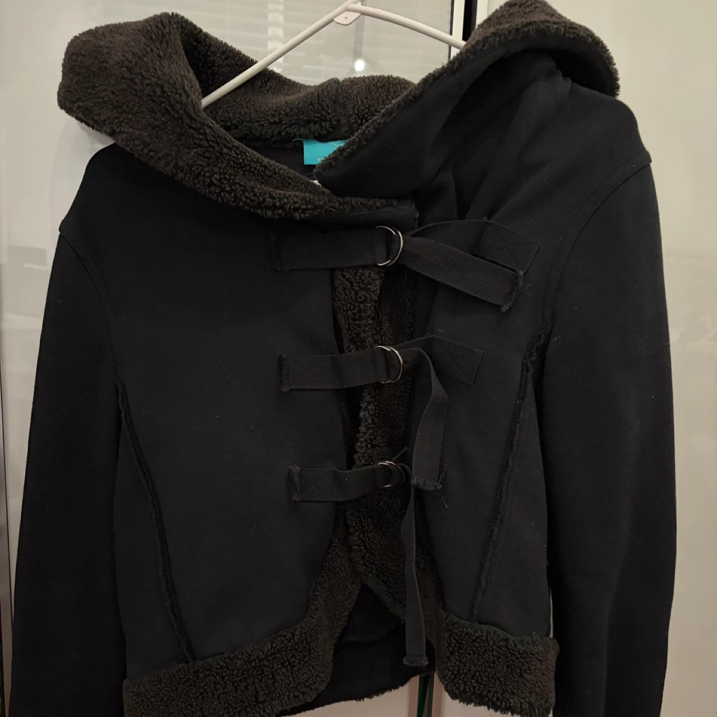 Selling my mom’s black hooded jacket in a size medium (fits more like a small) that was bought in Hong Kong. It's black with a soft, brown furry lining. Perfect for chilly weather!