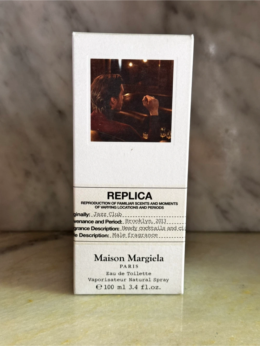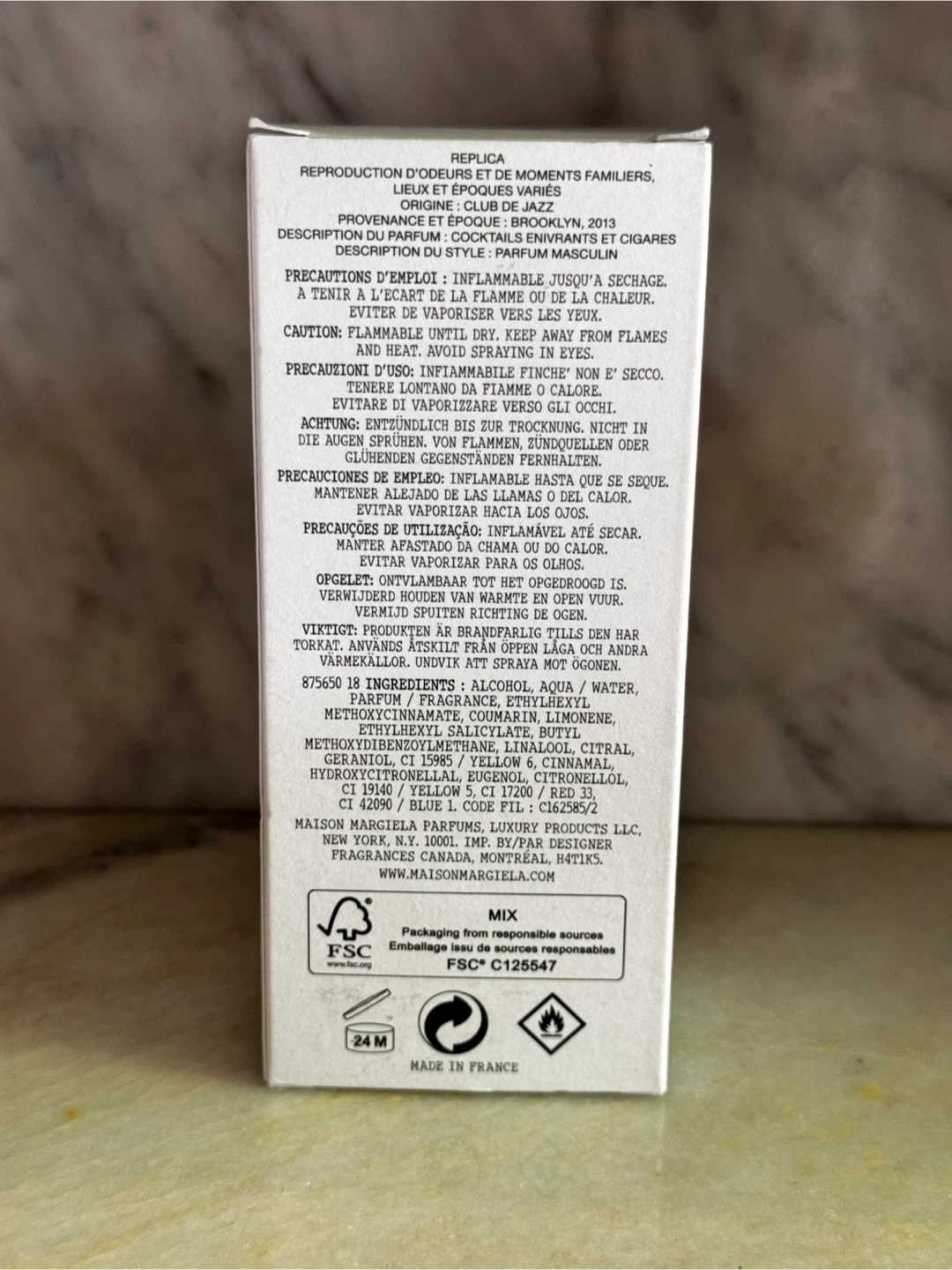 Maison Margiela REPLICA Jazz Club Eau de Toilette. "Heady cocktails and cigars" inspired fragrance. Male fragrance. 100 ml 3.4 fl.oz. Made in France. Retails for $170