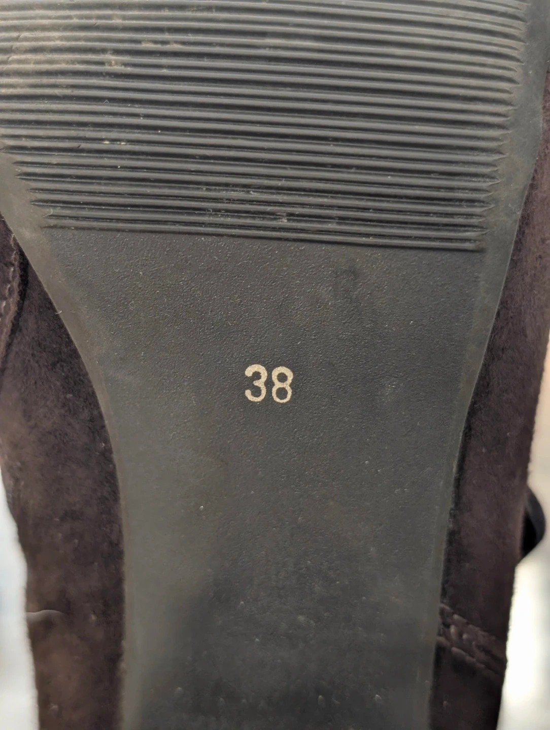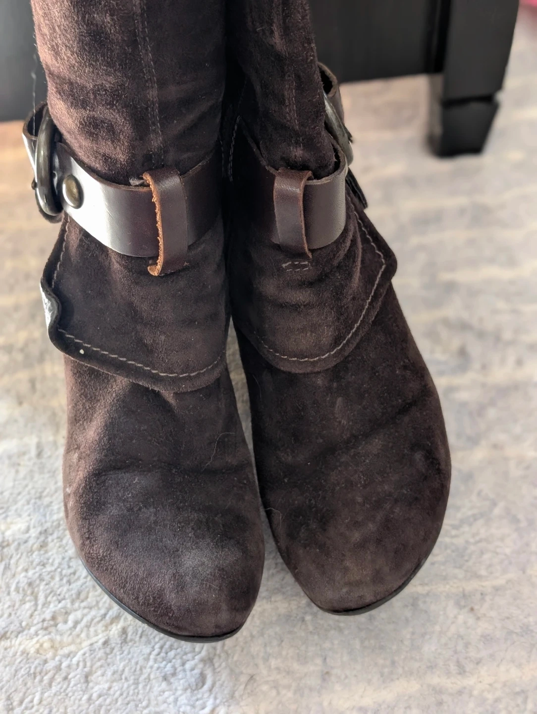 These stylish brown suede knee-high boots are designed with a decorative ankle strap and buckle. They feature a convenient side zipper for easy on and off. These boots are made from a suede material and have a dark brown colour.