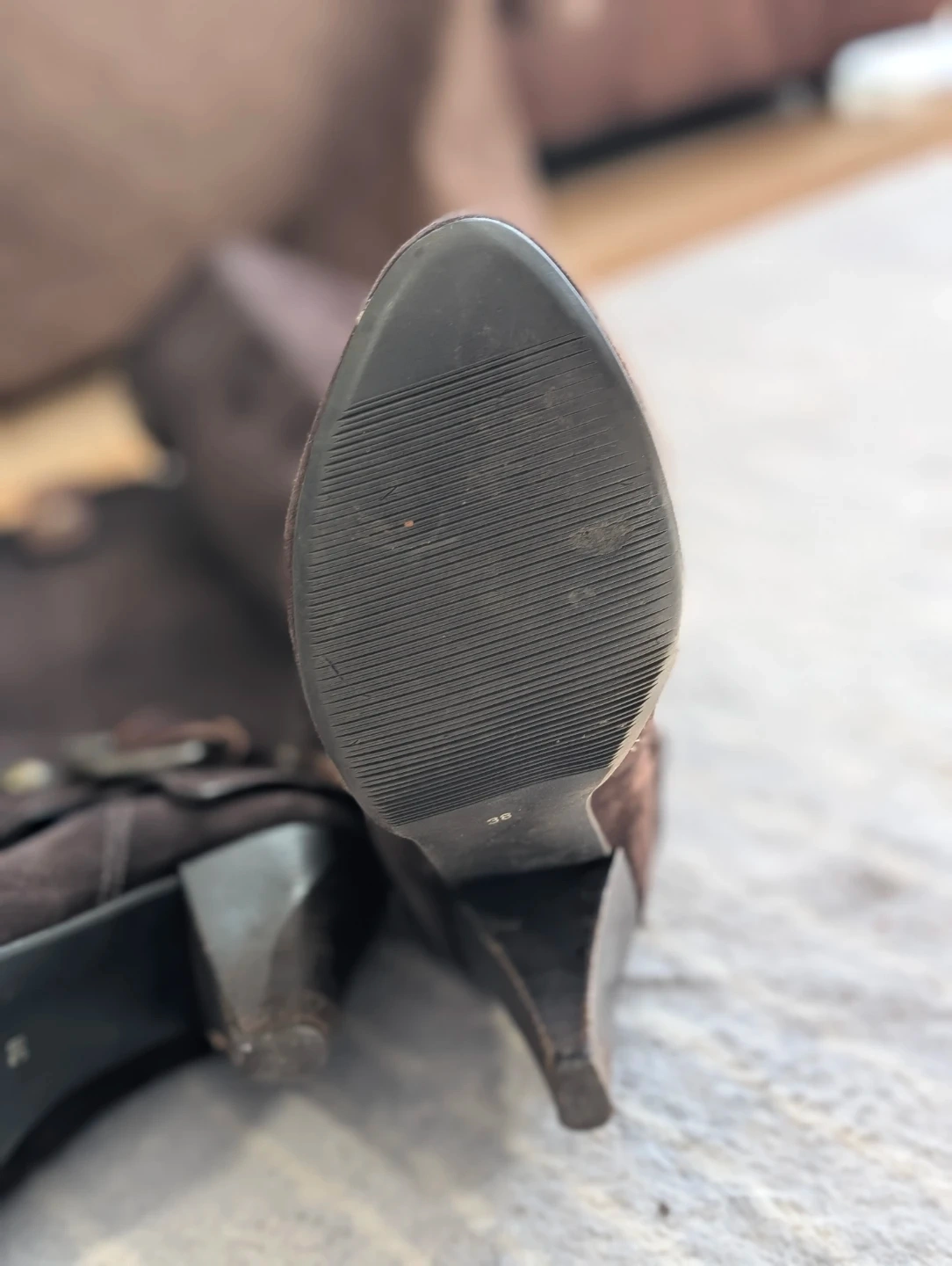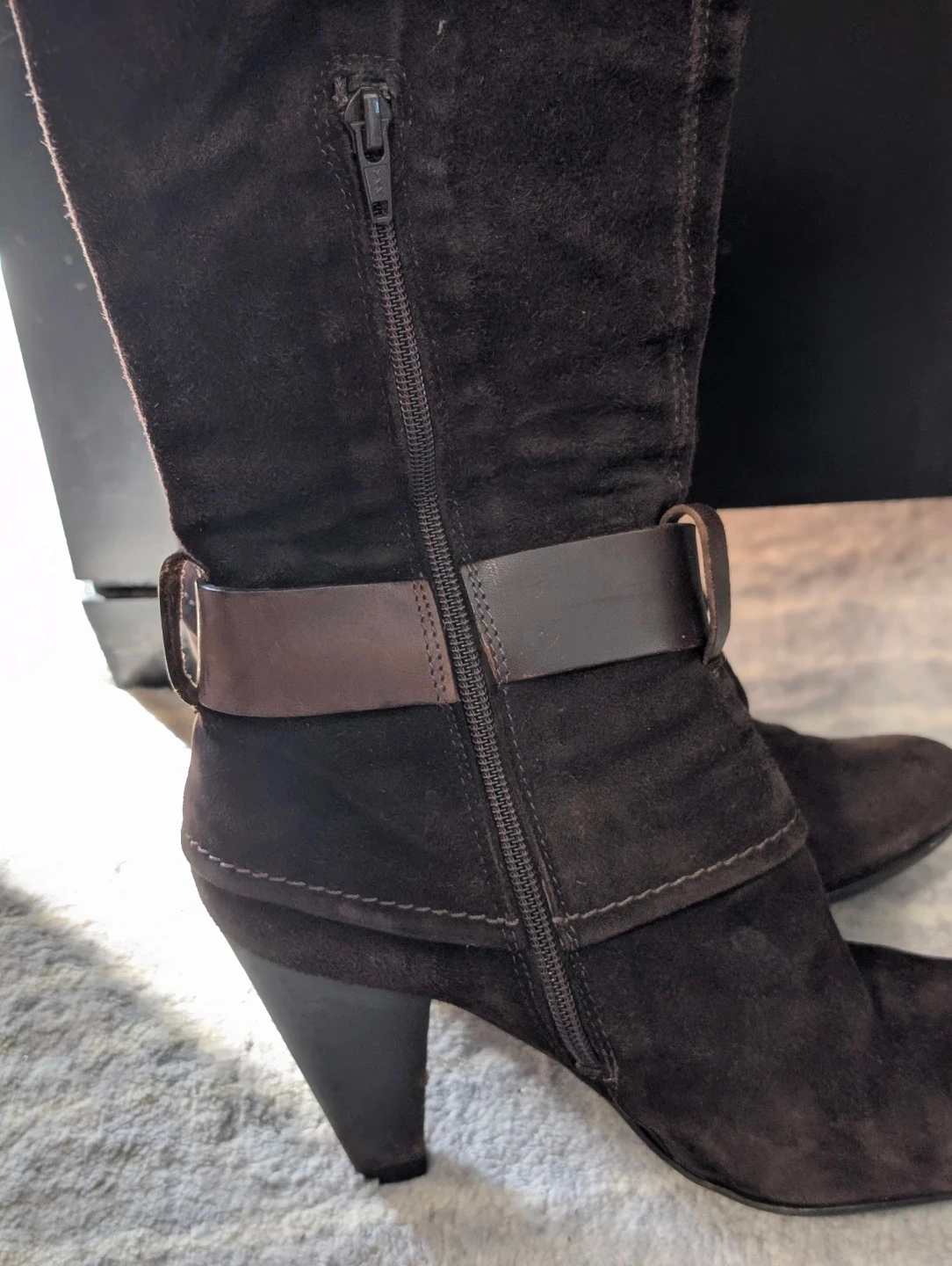 These stylish brown suede knee-high boots are designed with a decorative ankle strap and buckle. They feature a convenient side zipper for easy on and off. These boots are made from a suede material and have a dark brown colour.