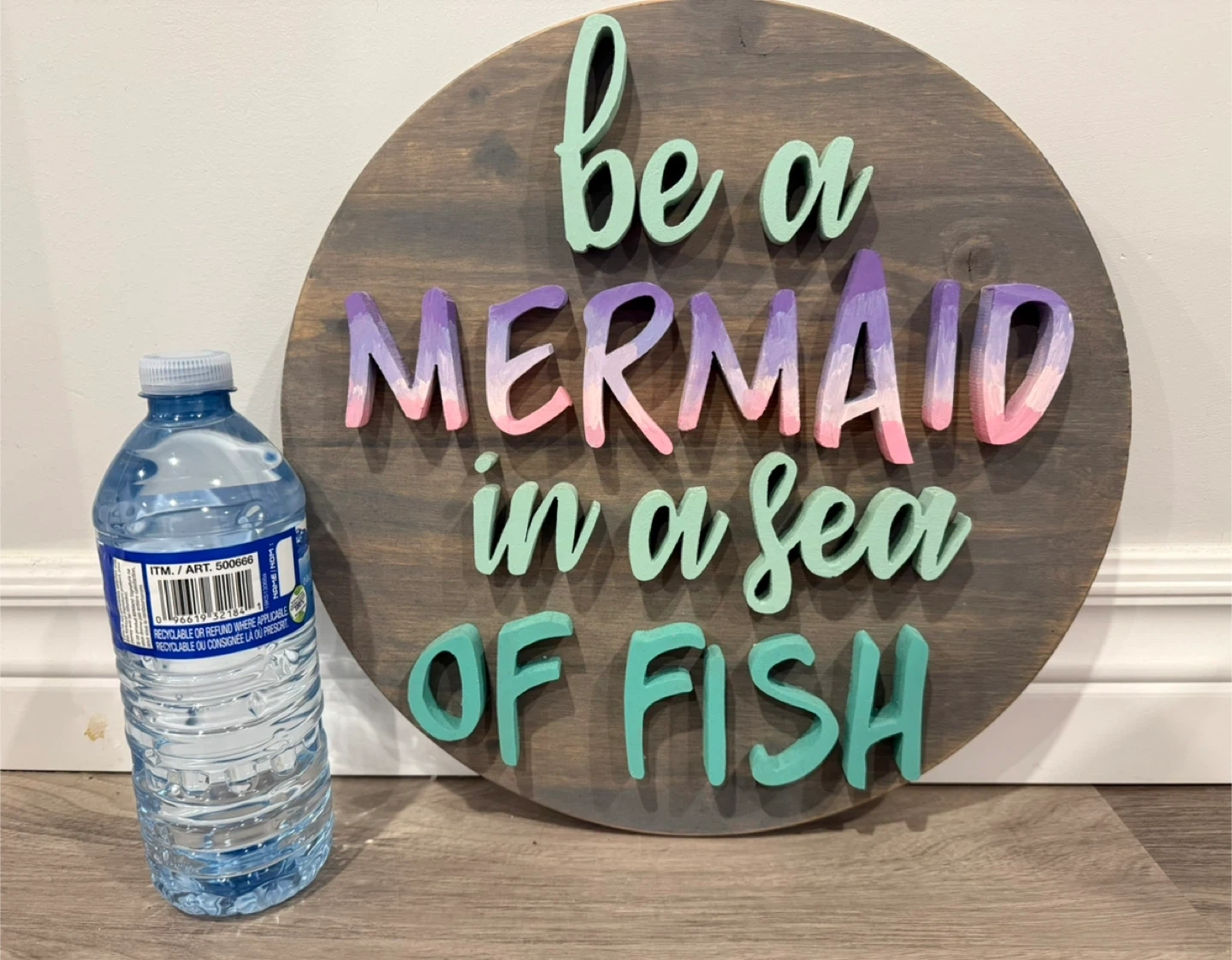 Decorative wooden sign with raised lettering. Features a motivational quote about embracing individuality. The circular wood base has a dark stain, and the letters are painted in a gradient of teal, pink, and purple. This piece adds a whimsical touch to any room!