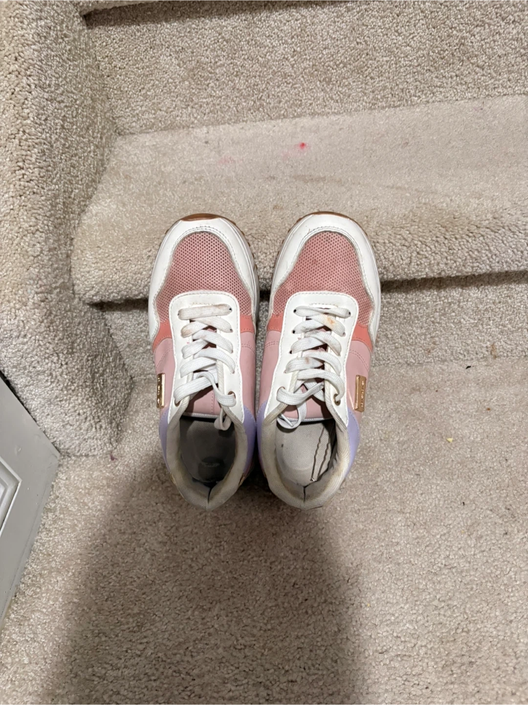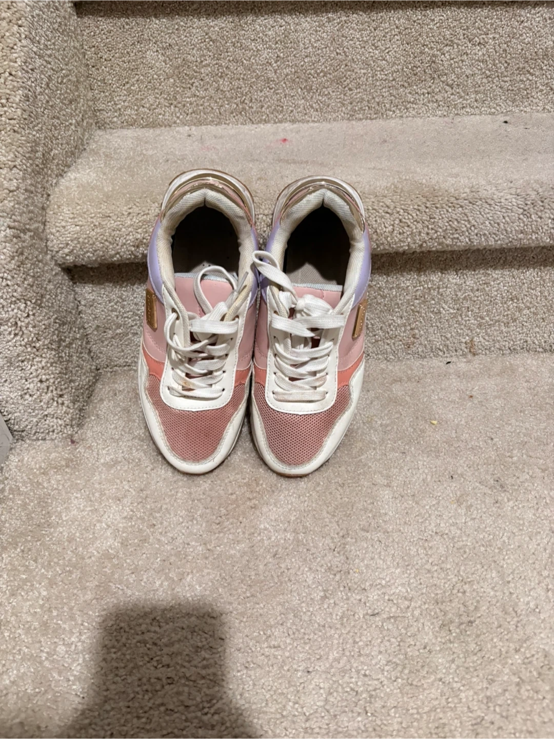 These are Guess women's sneakers in pink, white, and light purple. They have a white lace-up closure and a rubber sole. The sneakers feature a stylish design with gold accents.