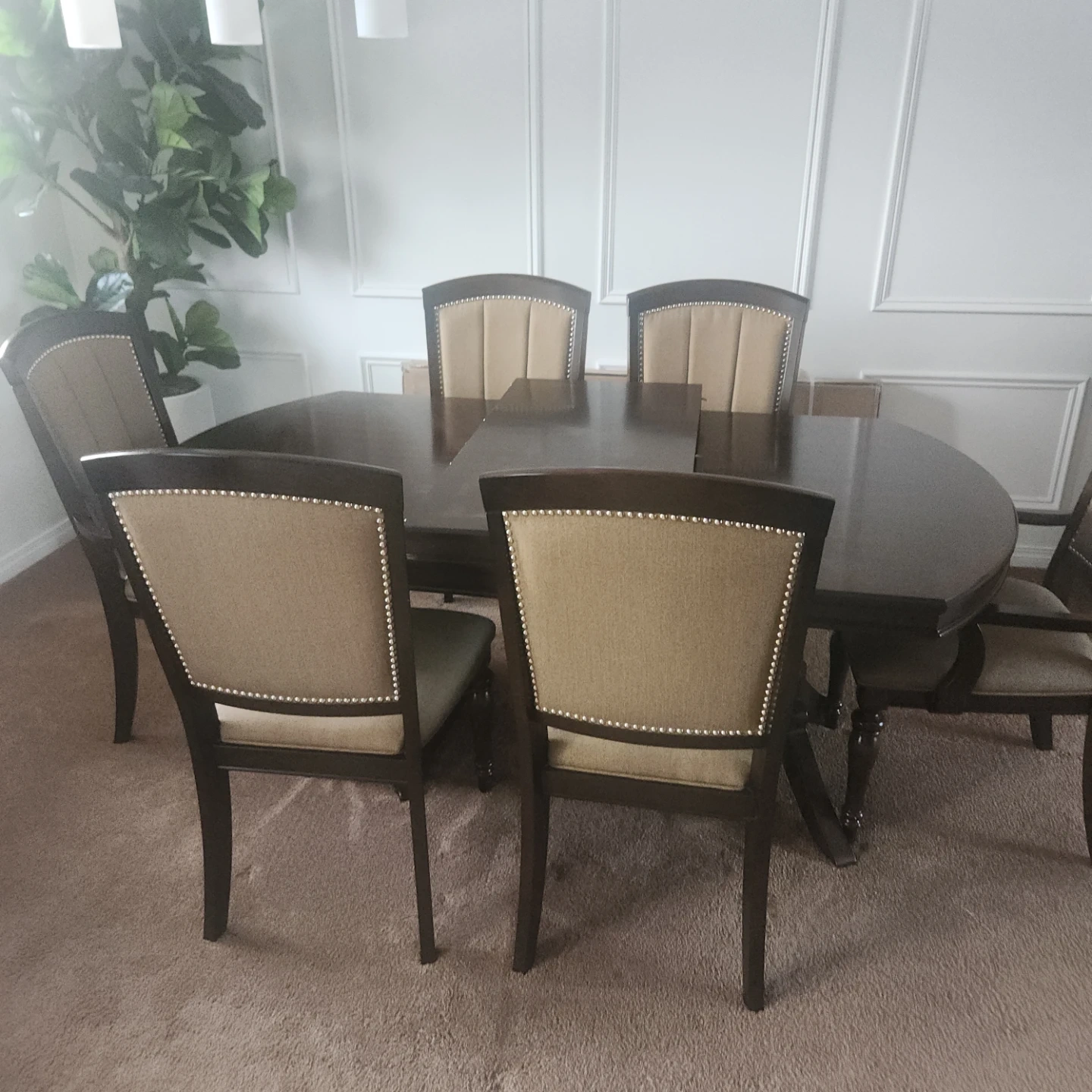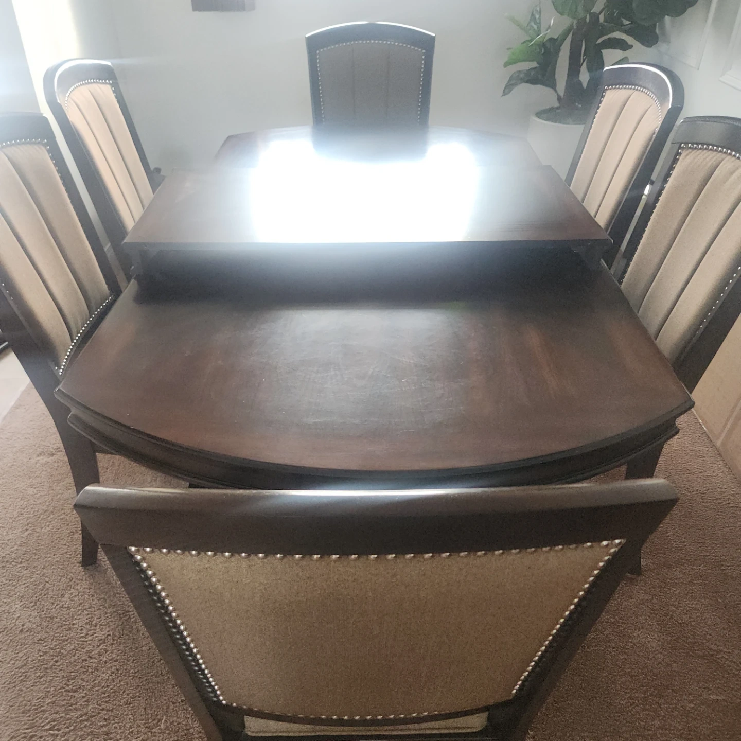 Dark wood dining table with six upholstered chairs. Chairs have beige fabric seats and backs with decorative nailhead trim. Table includes an extension leaf.