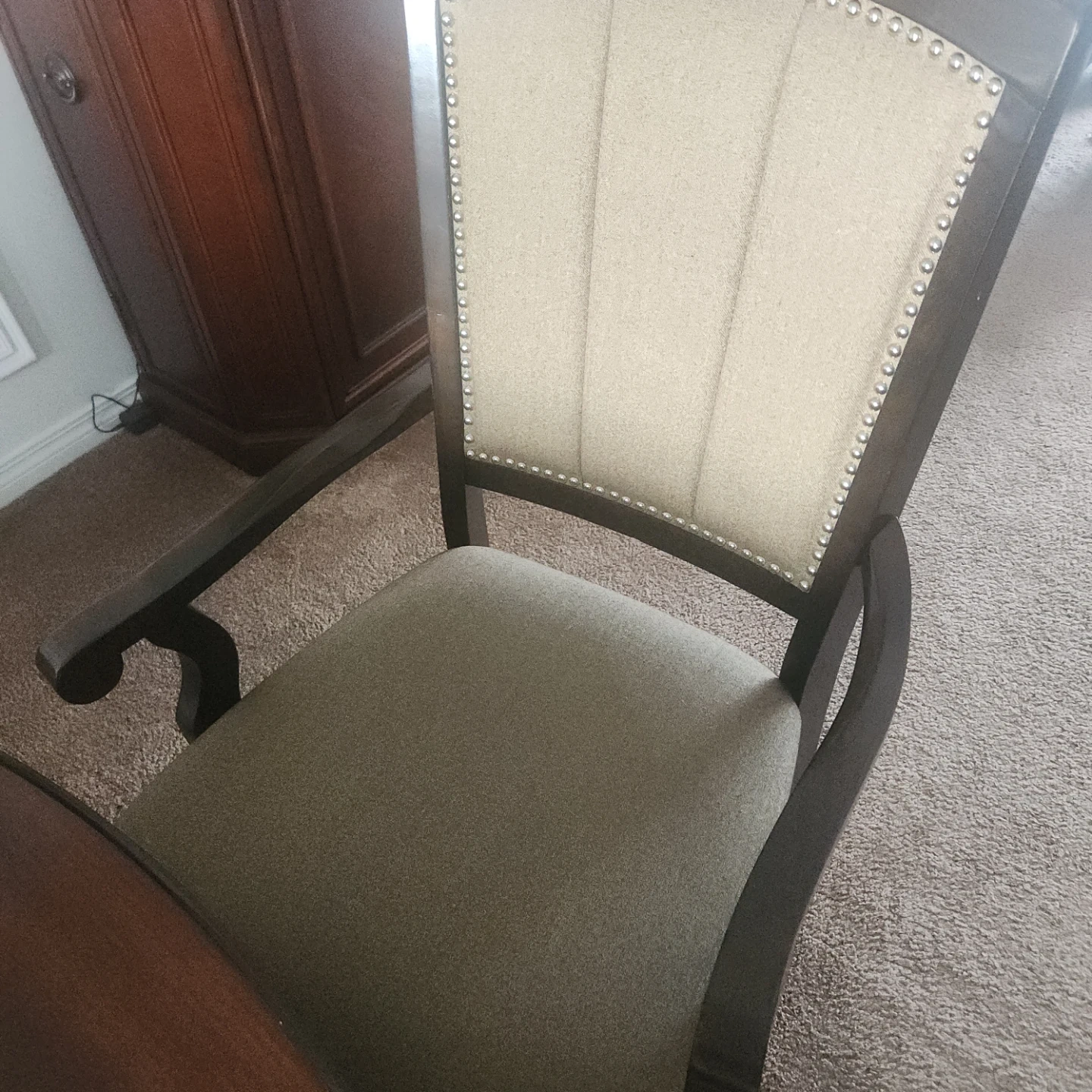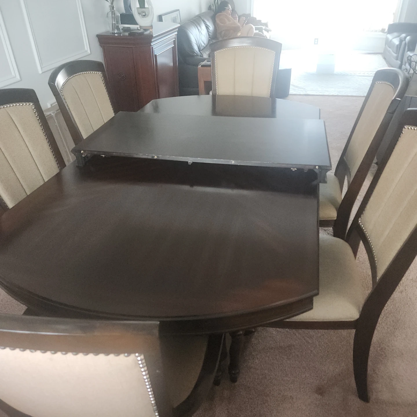 Dark wood dining table with six upholstered chairs. Chairs have beige fabric seats and backs with decorative nailhead trim. Table includes an extension leaf.