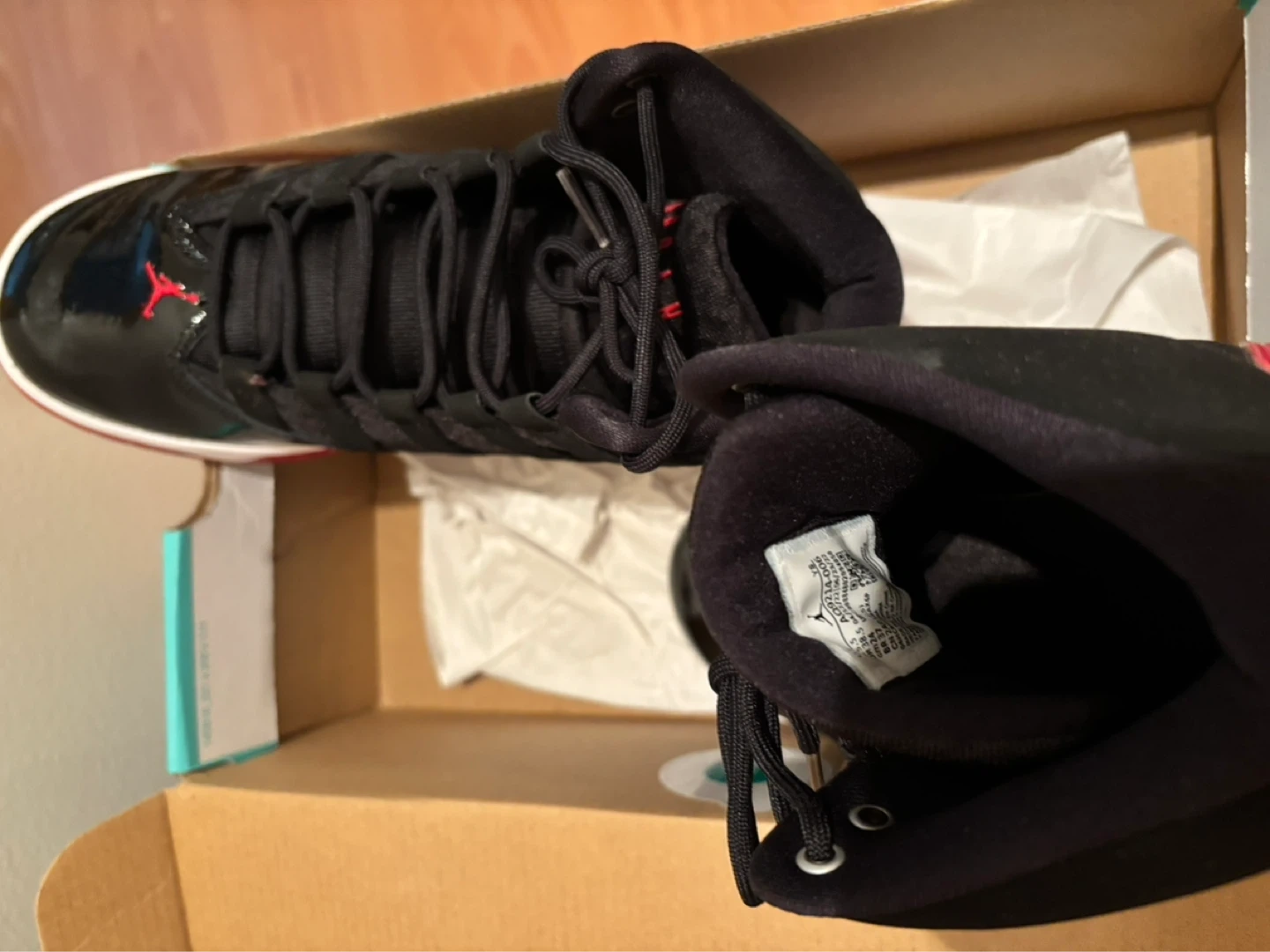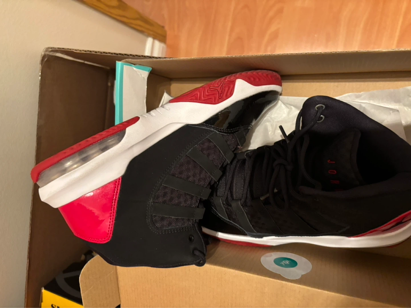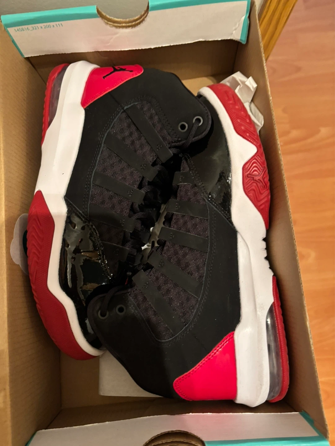 Fresh Jordan Max Aura 2 sneakers here. Black, red, and white colorway. Patent leather details on the toe and sides. Looks super clean, comes with the box too.