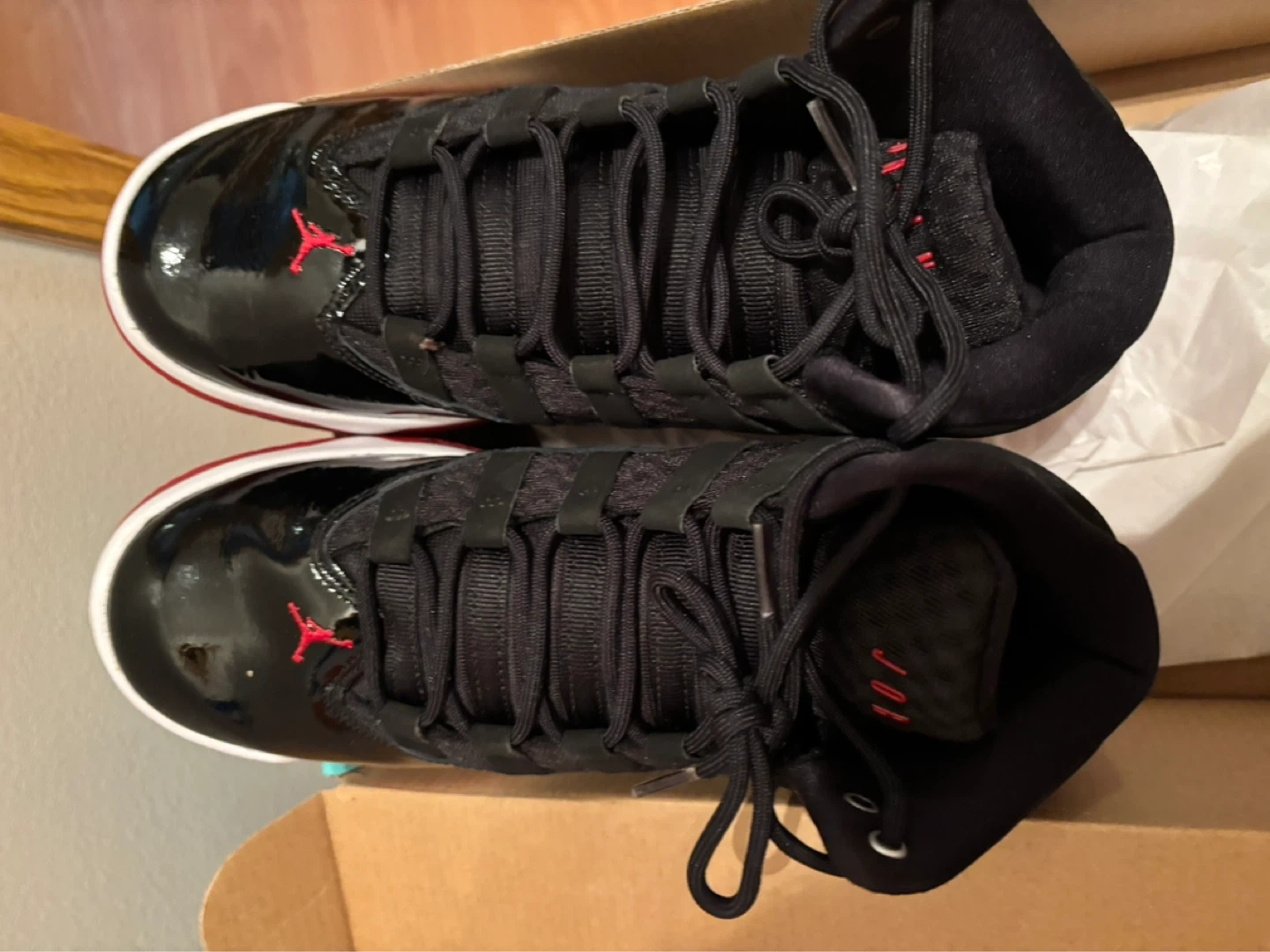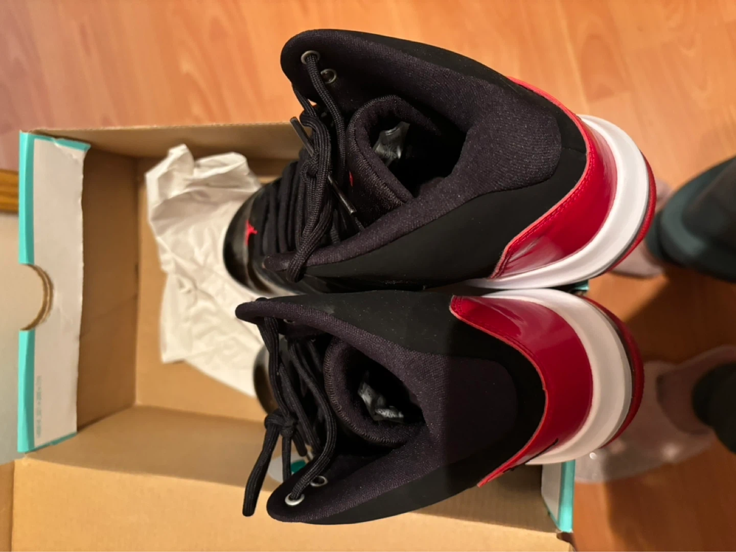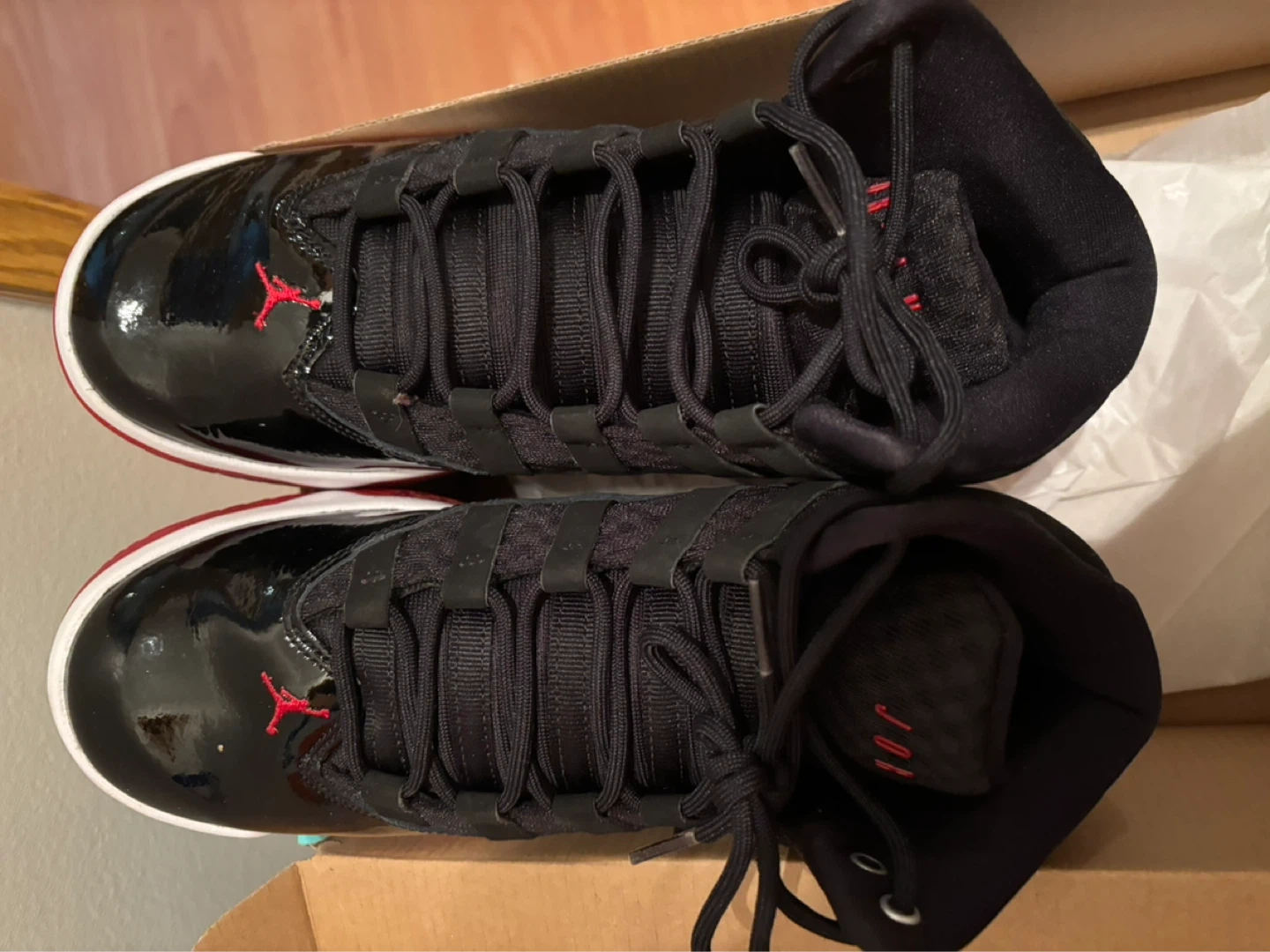Fresh Jordan Max Aura 2 sneakers here. Black, red, and white colorway. Patent leather details on the toe and sides. Looks super clean, comes with the box too.