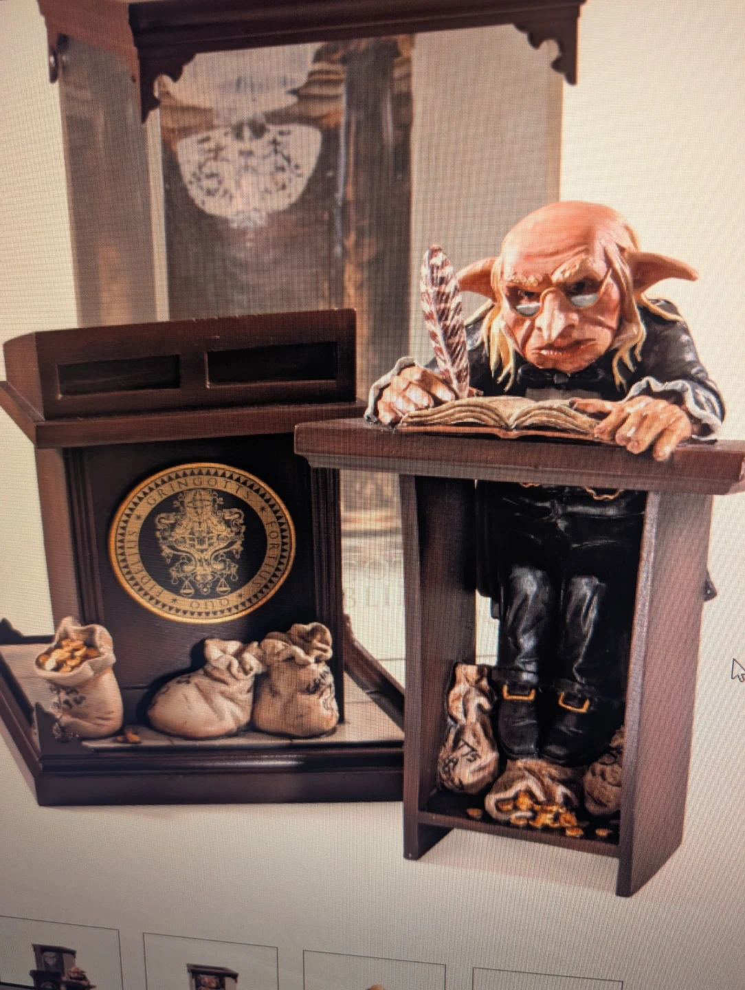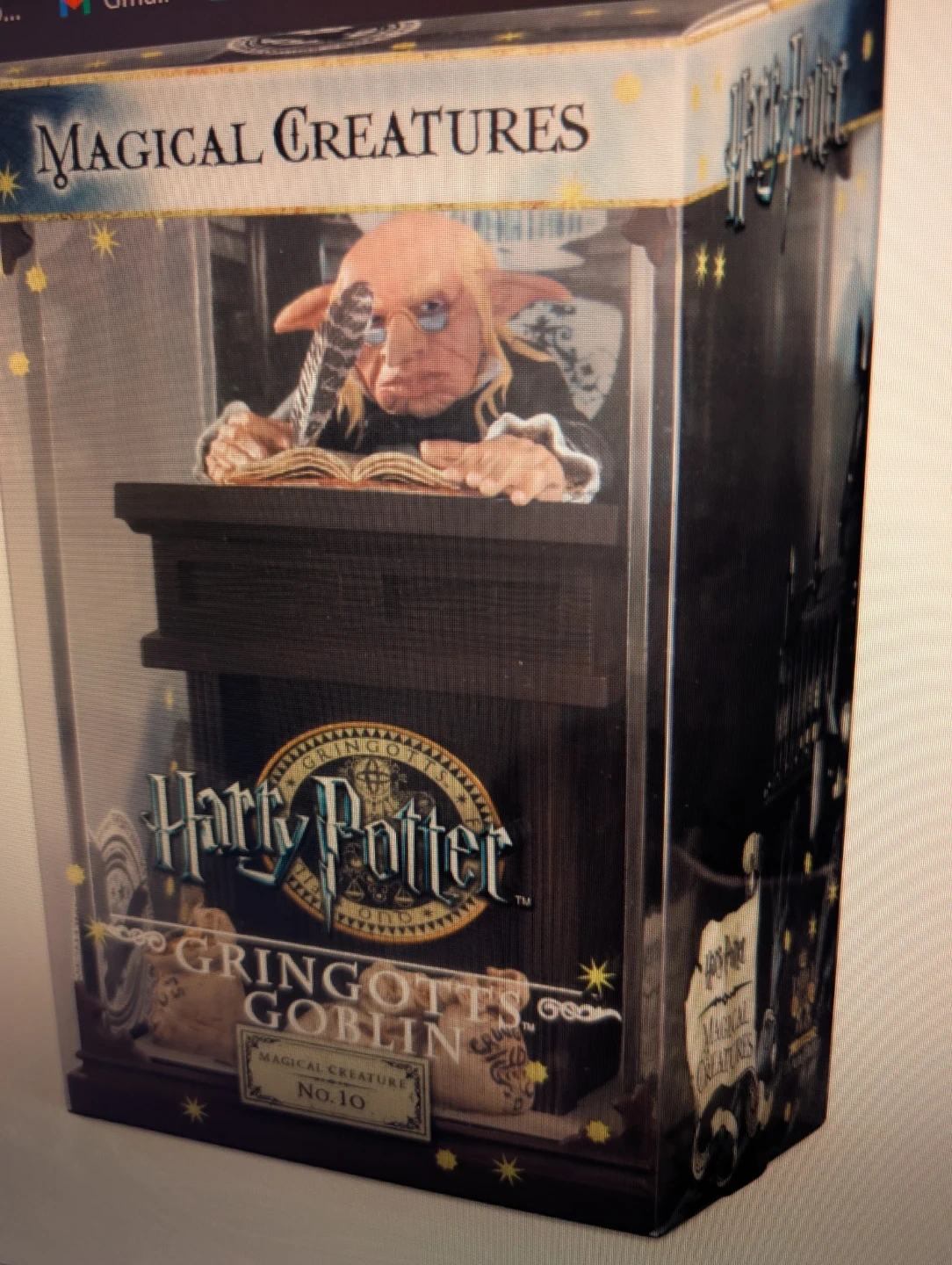 This is a Harry Potter Magical Creatures Gringotts Goblin figurine, No. 10. It depicts a goblin writing at a desk with bags of gold. It comes in its original packaging.