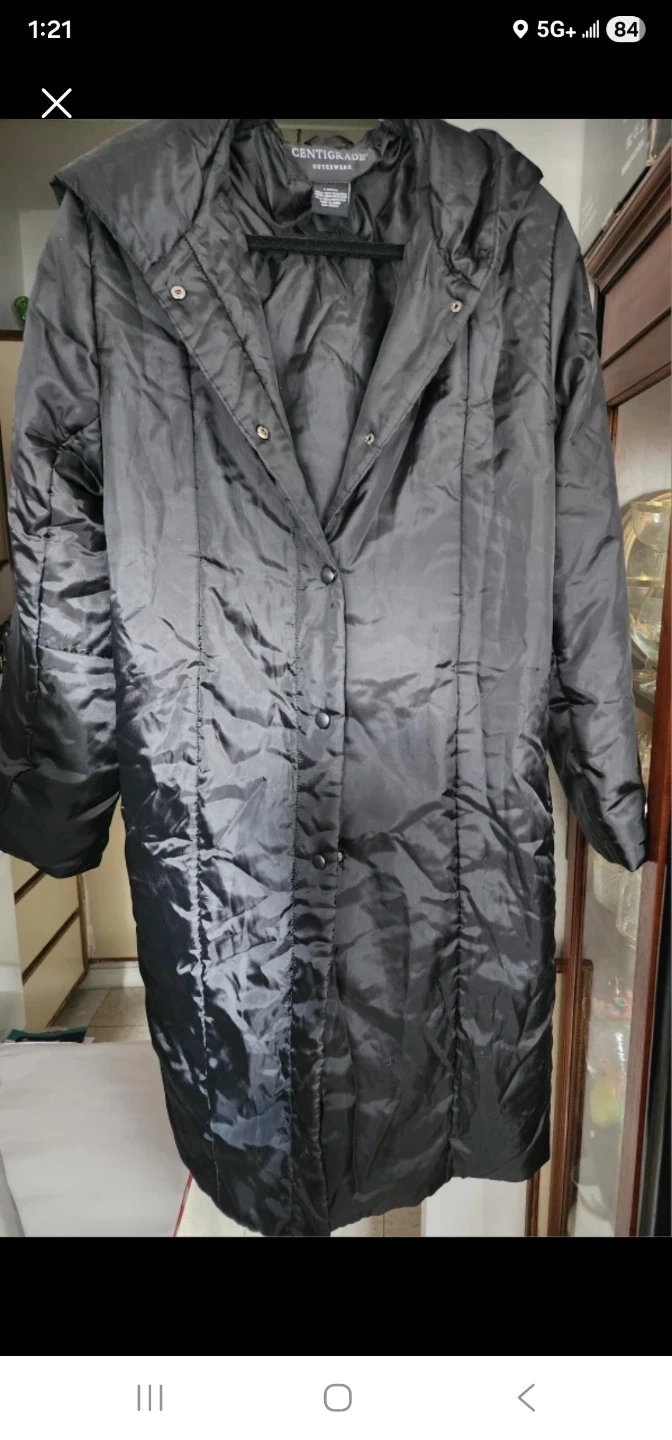 Black Centigrade Outerwear! It's a stylish and functional piece, perfect for keeping warm. It features a button-up front and a hood. Light and warm