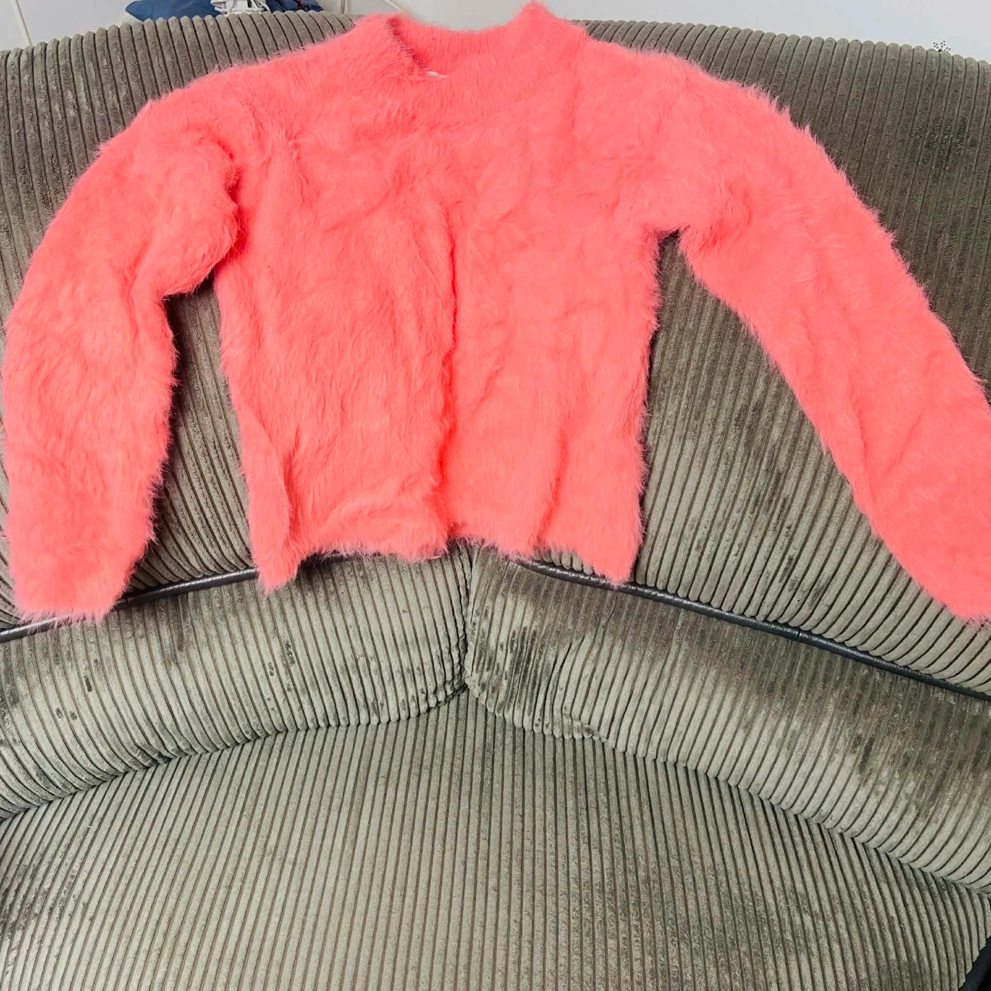 This H&M sweater is a fuzzy mock neck style in a vibrant coral colour. It's made from a soft blend, perfect for adding some warmth and colour to your outfit. Size is extra small.