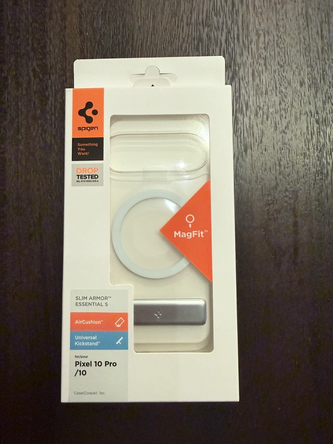 • Case: Spigen Slim Armor Essential S – Features MagFit (MagSafe compatible) and a built-in kickstand for watching videos.