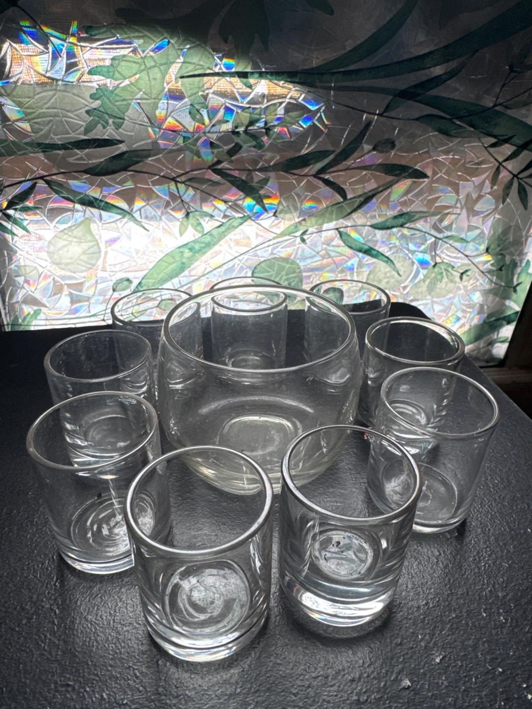 This set includes eight clear glass tumblers and one glass bowl. The tumblers appear to be a standard size, and the bowl is larger. They're made of clear glass.