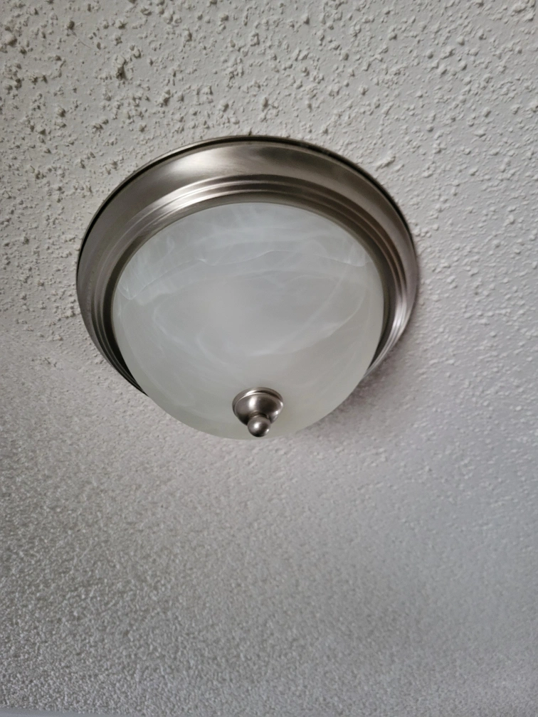 Nice ceiling light, brushed nickel finish. White glass shade. Easy installation. I will have 3 available. $5 each.