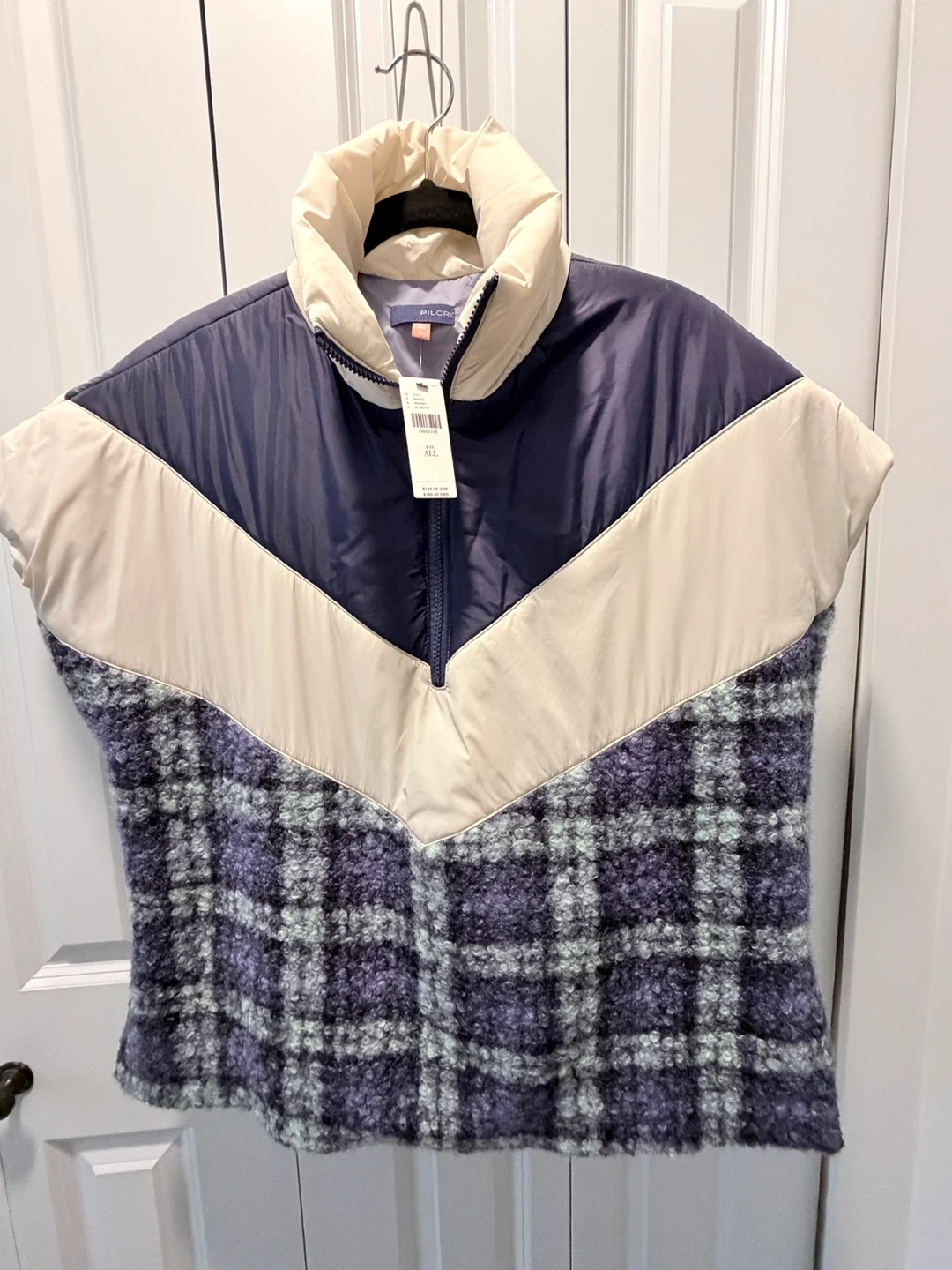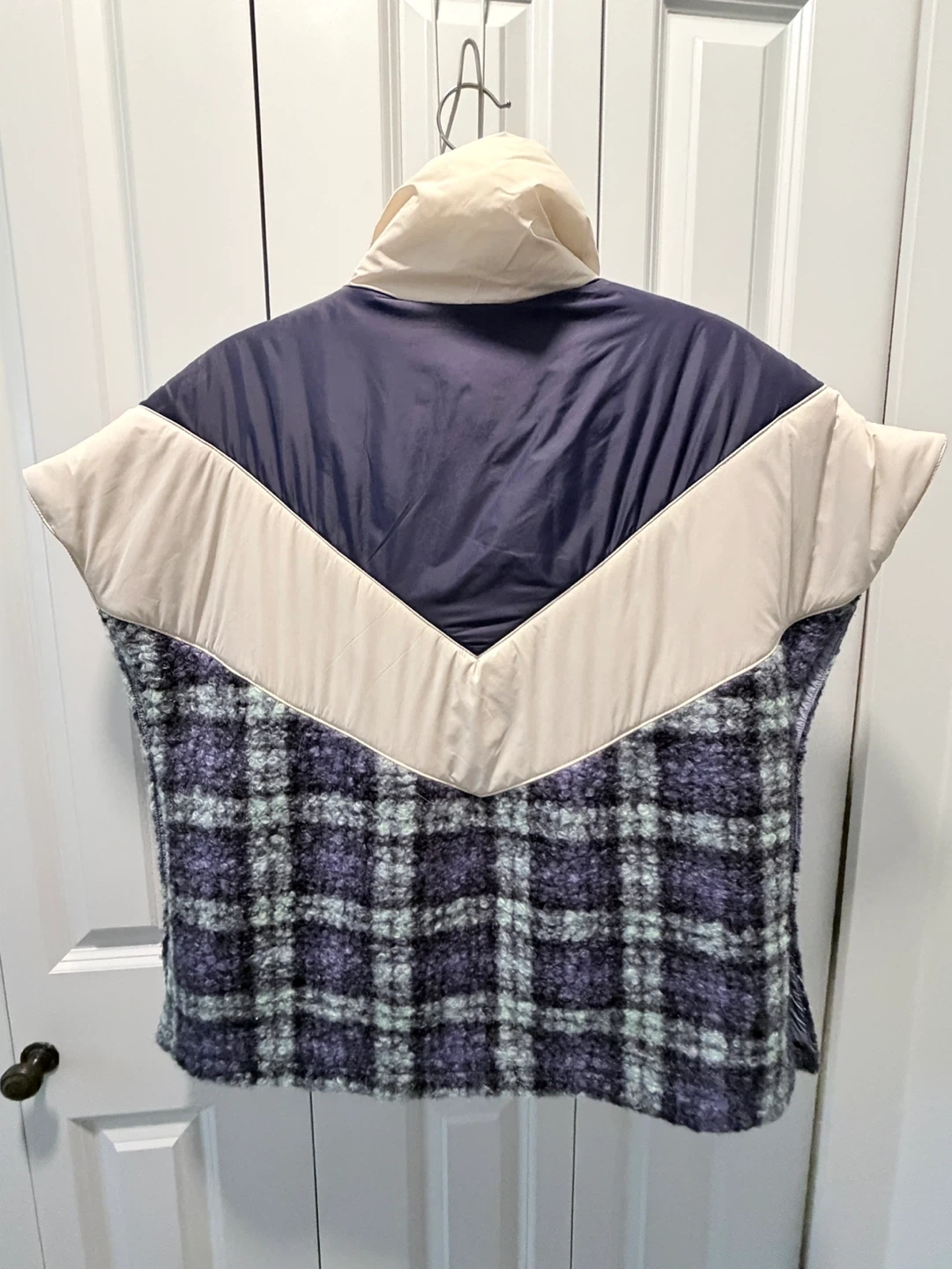This poncho with tags still on was from Anthropology. The vest features a cozy, textured plaid bottom with quilted puffer details on the upper half. It's a sleeveless design with a high collar and quarter-zip closure. A great layering piece for transitioning seasons!