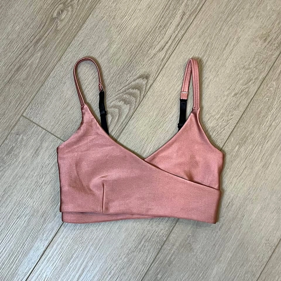 Shiny pink INDUSTRY wrap bralette with adjustable straps. Cross-over in the front. Inside back logo is rubbing off. Otherwise excellent condition. Size S.