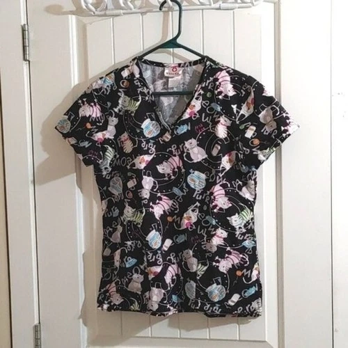 White Cross XS black nurse scrubs top shirt blouse black cats pa