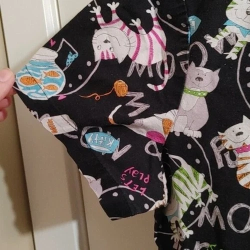 Short sleeve Cats, purr, meow, fish, aquarium , play, yarn pattern Black, white Pink, blue, orange, gray, brownCotton XS extra smallTwo large pockets Hint of a 5 way stretch Approx measurements pit to pit 19 in