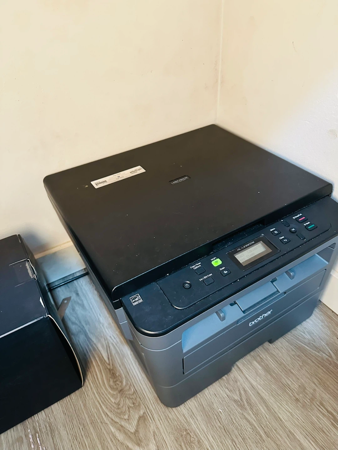 This Brother laser printer is black and it's a monochrome laser printer. It's a compact all-in-one model that prints, copies, and scans. It's got a wireless connection option. This would be useful for a home office or small business printing needs.
