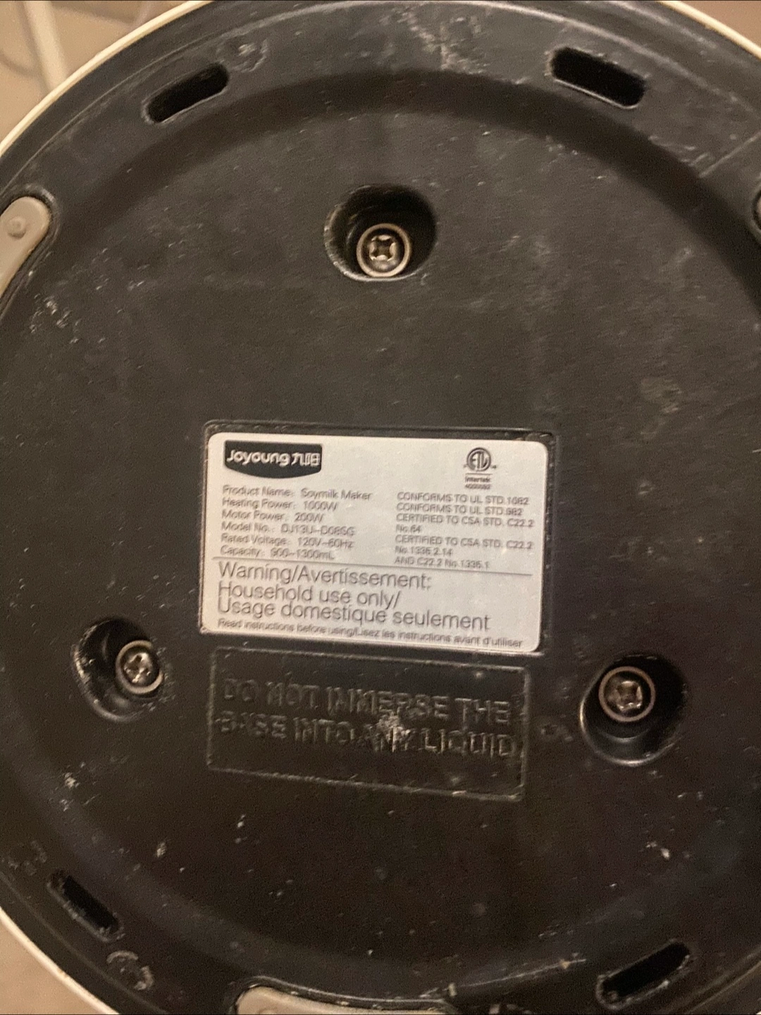 I'm selling a Joyoung Soymilk Maker, model DJ13M-D98SG. It has a capacity of 900-1300mL and a motor power of 200W. The rated voltage is 120V~60Hz. Great for making fresh soymilk at home!