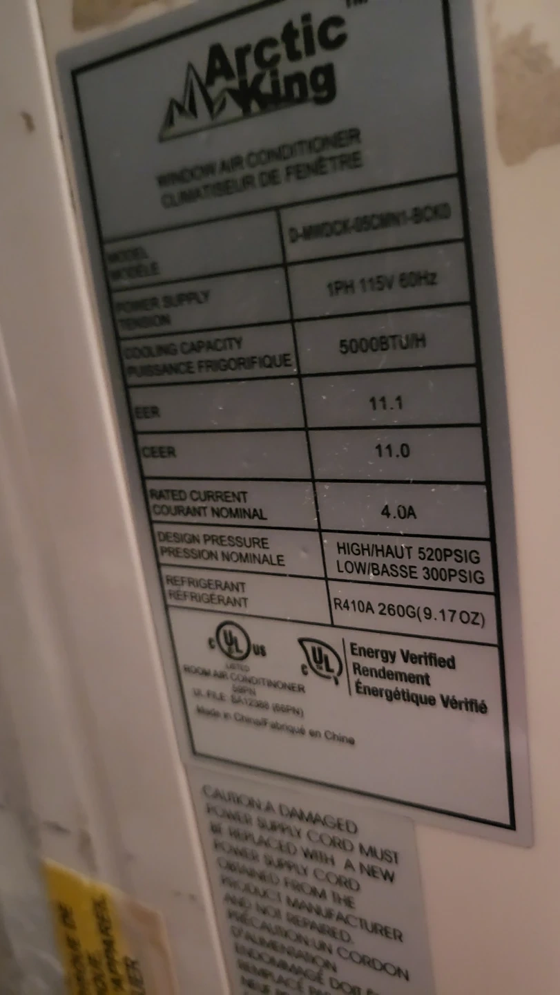 Arctic King window air conditioner with 5000 BTU/h cooling capacity. It has a 1PH 115V 60Hz power supply and uses R410A refrigerant. This unit is great for keeping a room cool during warmer months!