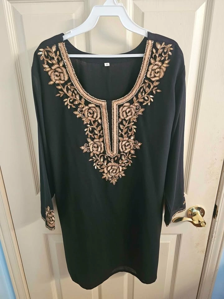 New, never worn top. It can be paired with jeans or black pants for formal or semi-formal events. Very comfortable and elegant. Size 32 or medium. Black with gold thread embroidery. Very smart.
