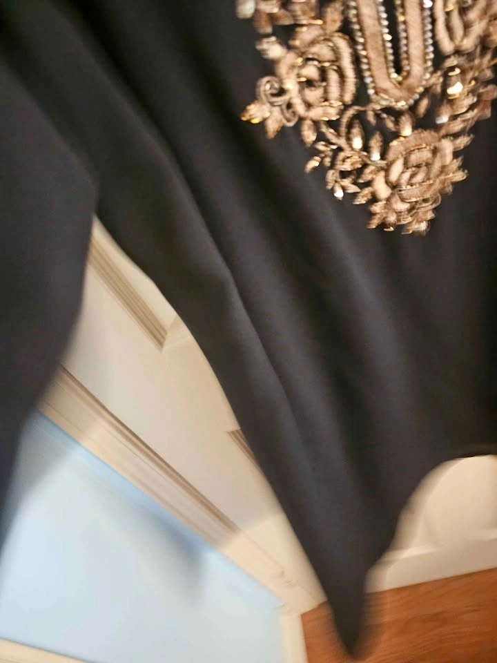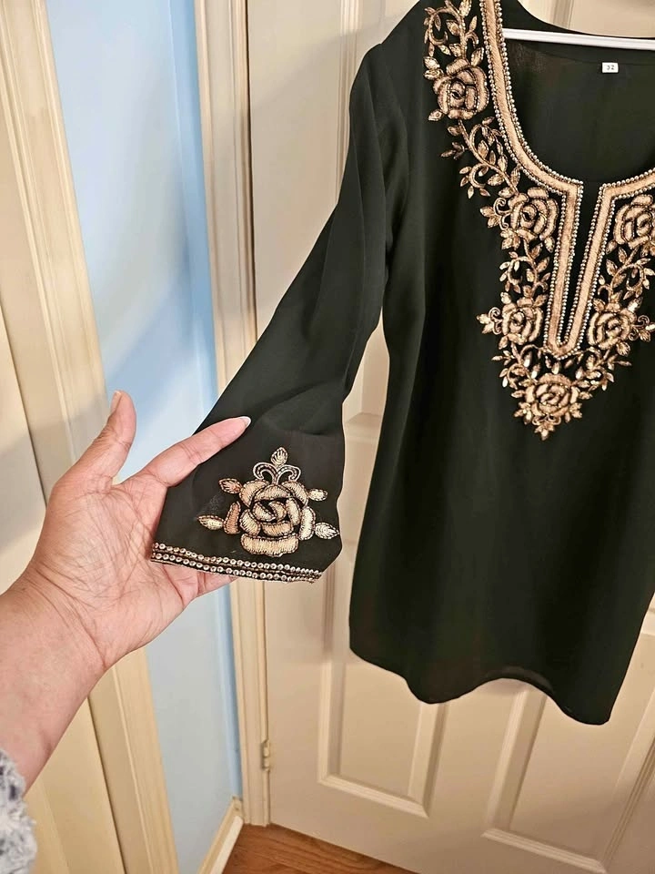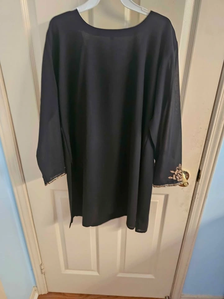New, never worn top. It can be paired with jeans or black pants for formal or semi-formal events. Very comfortable and elegant. Size 32 or medium. Black with gold thread embroidery. Very smart.