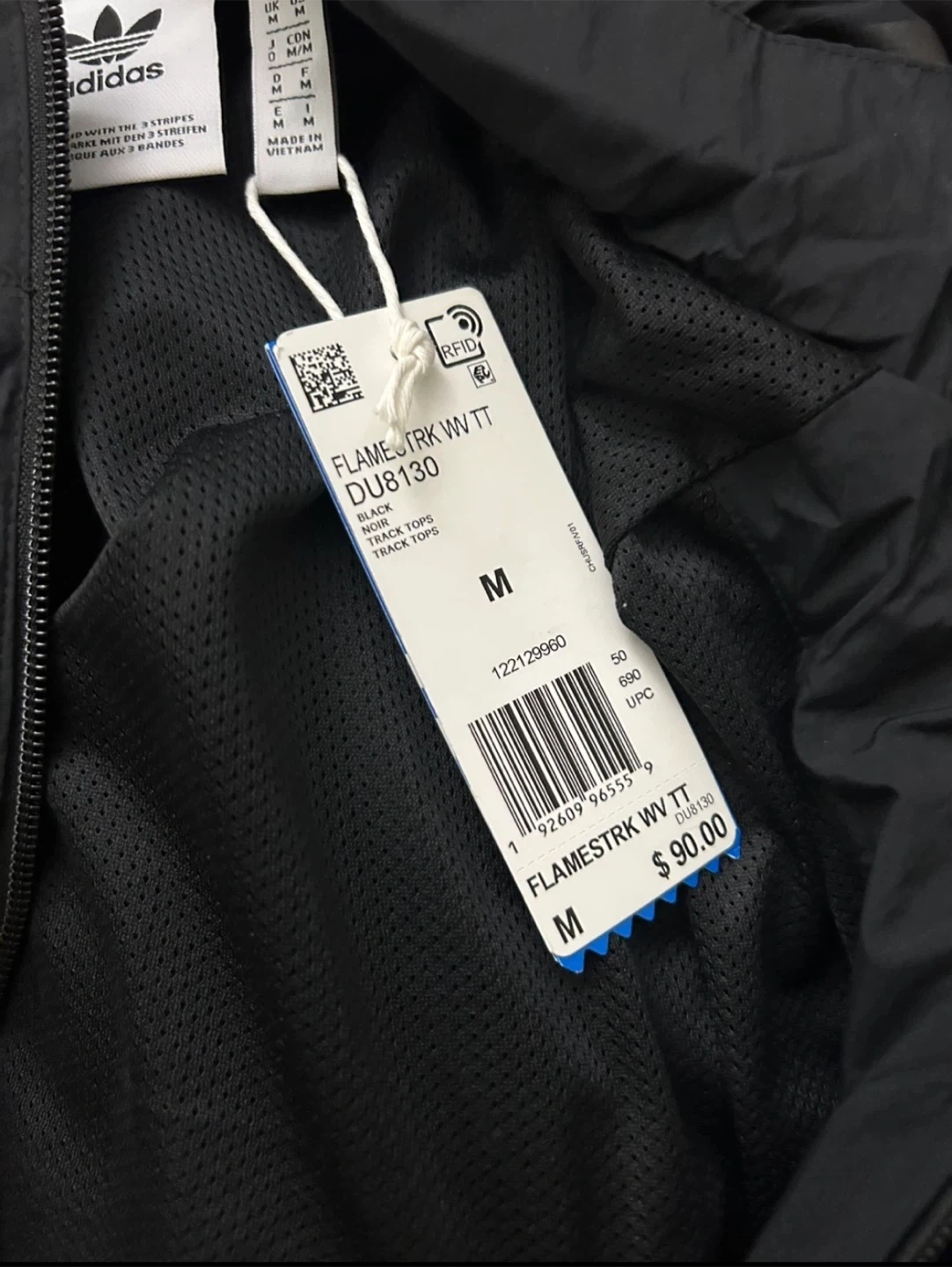 This is an Adidas FLAMESTRK WVN TT track jacket in black. It's a size medium and made in Vietnam. It features the iconic Adidas stripes on the sleeves and has a full zip closure with zippered pockets.