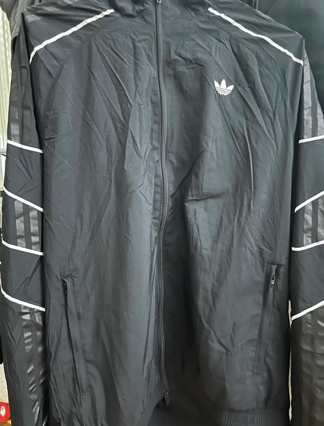 This is an Adidas FLAMESTRK WVN TT track jacket in black. It's a size medium and made in Vietnam. It features the iconic Adidas stripes on the sleeves and has a full zip closure with zippered pockets.