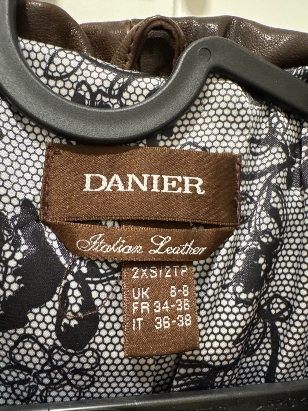 This Danier jacket is made from Italian leather. It features a stylish brown colour and a hidden hood. Size 2XS/ZTP. It was never worn.