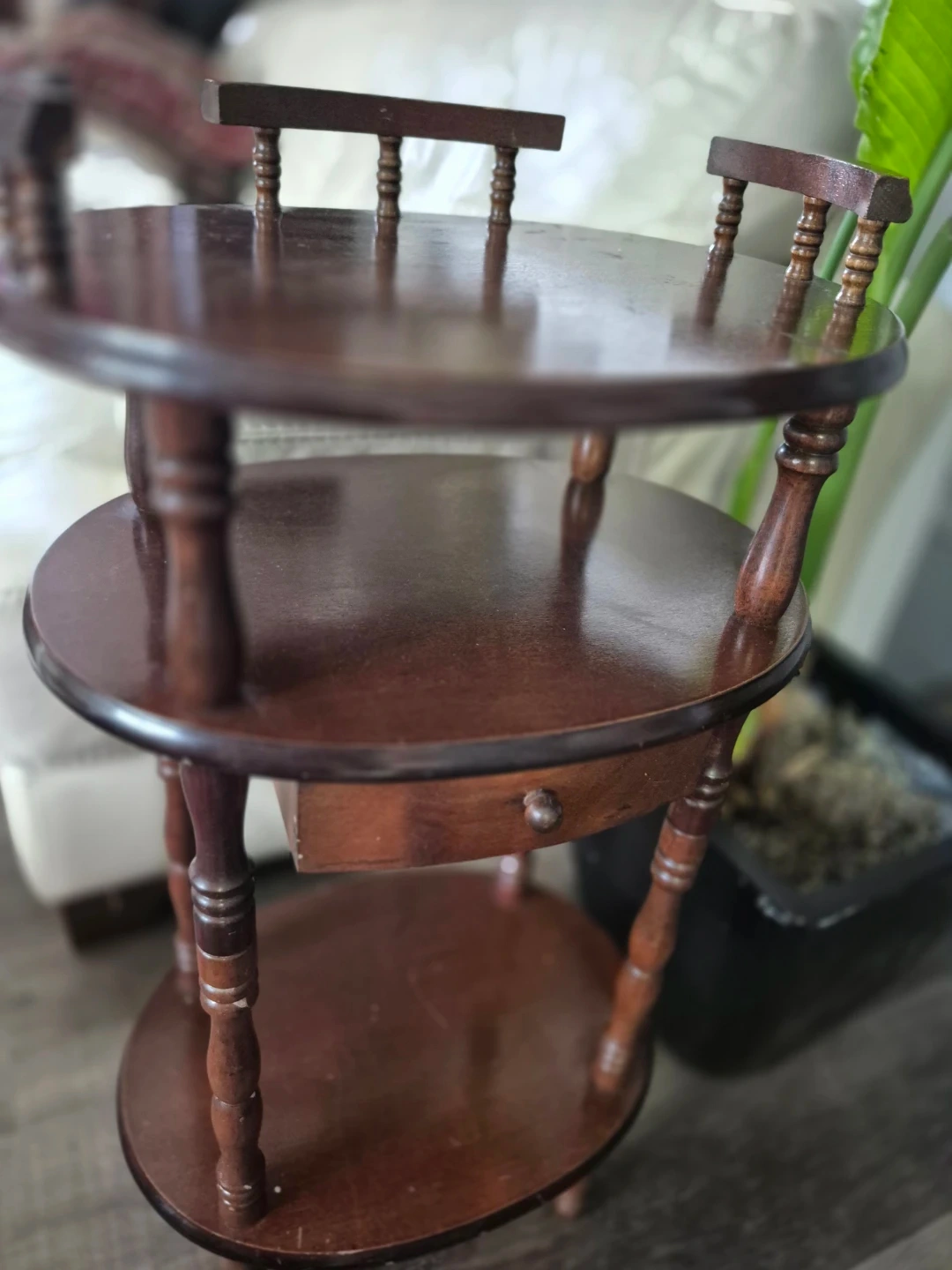 This is a three-tiered wooden side table, stained a dark brown. It features a small drawer for storage. It's a handy piece for holding your tea and a book.