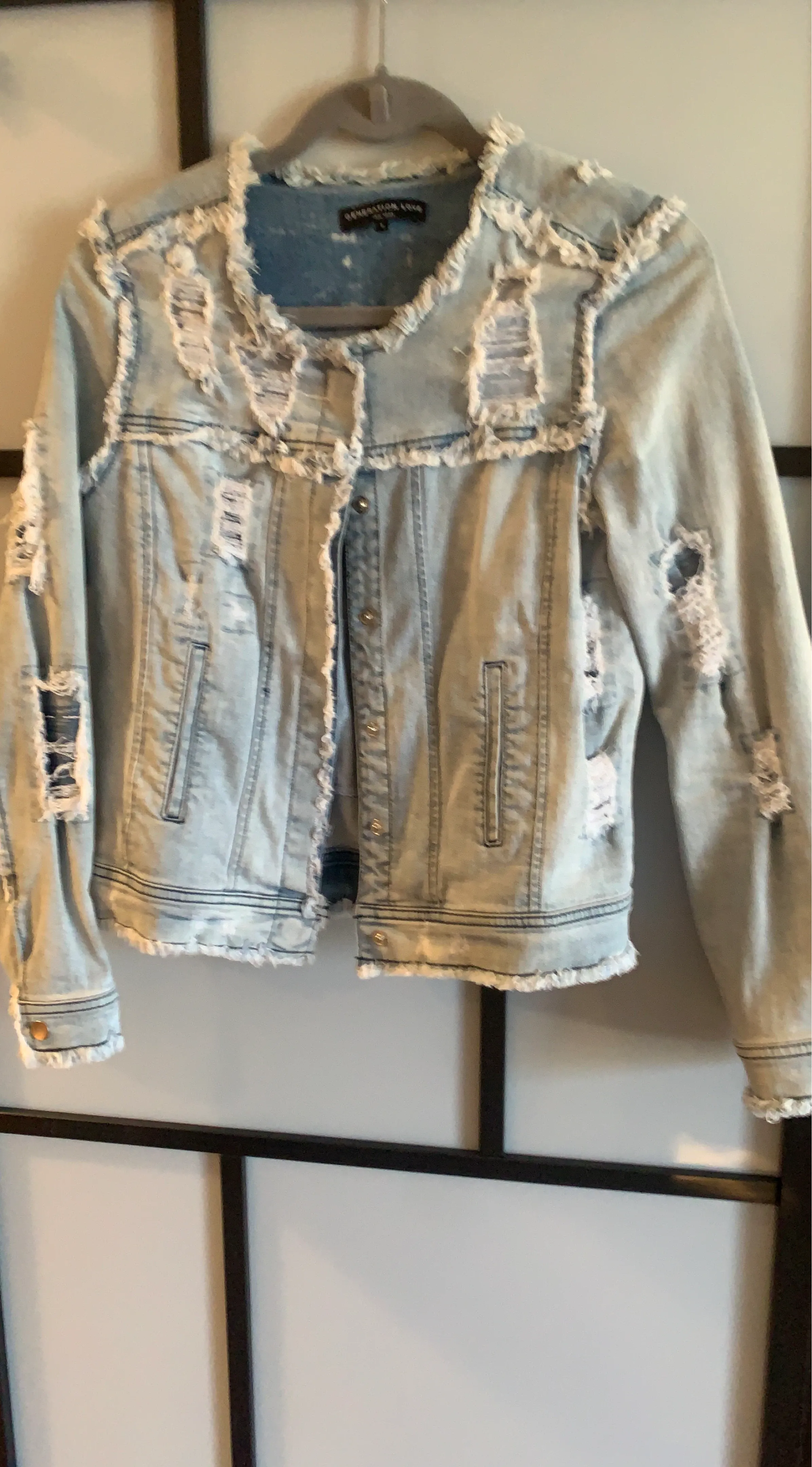 Light wash denim jacket with distressed details throughout. Features a snap on buttons-up front and frayed hem. This jacket adds a stylish edge to any outfit.