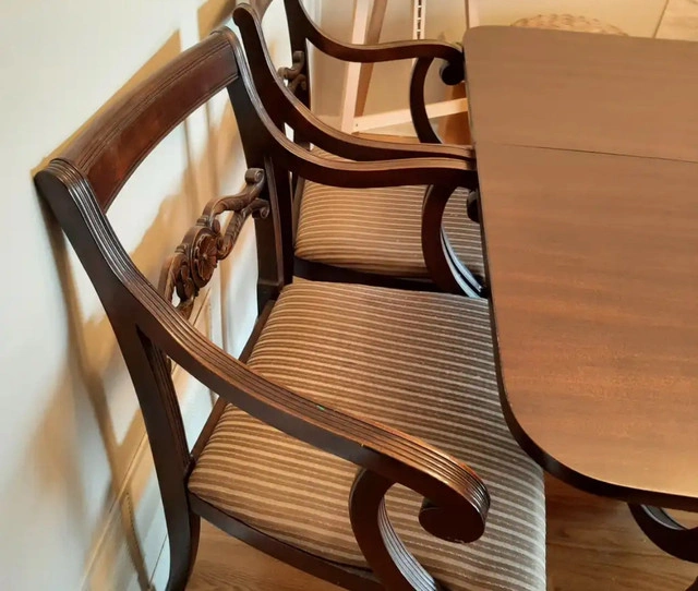 Elegant dining set. 4 chairs Extendable leaves. Great condition. Table dimensions: 38 inches x 52 inches. 2 extension leafs, each are 10 inches. Pickup only. Sheppard and Victoria Park area.