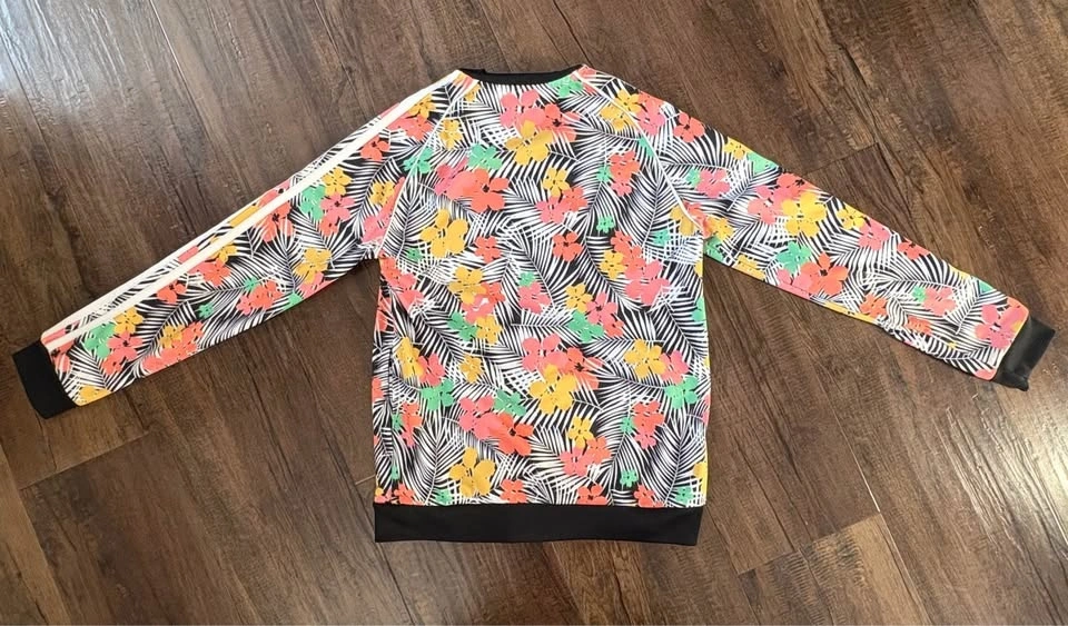 Adidas Girls’ Floral Track Jacket – Size Medium/11-12 Y. Bright and stylish Adidas girls’ full-zip track jacket featuring a colorful tropical floral print. Classic three-stripe design down the sleeves with black ribbed cuffs, collar, and waistband for a sporty look.