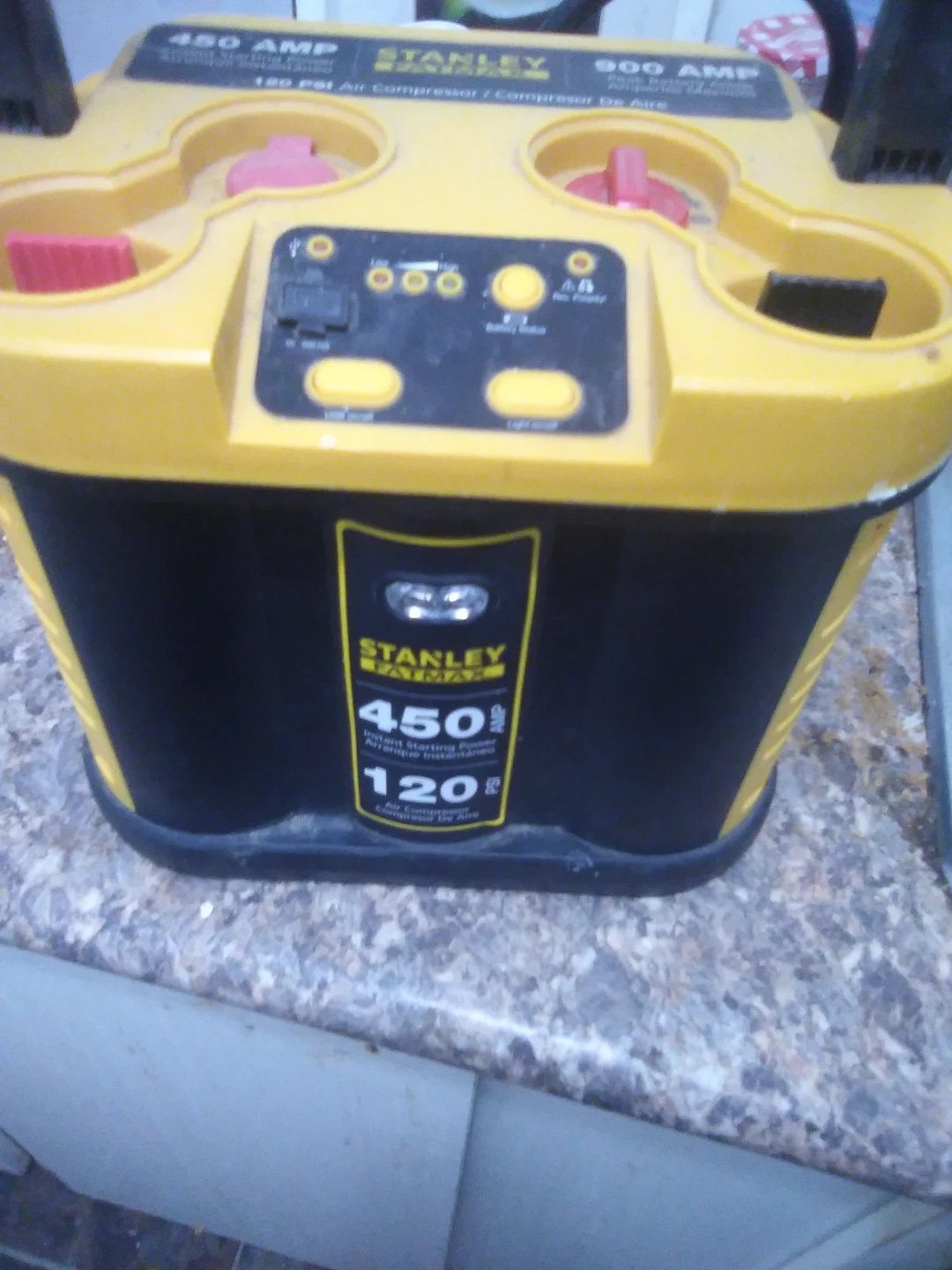 This Stanley FatMax jump starter offers 450 AMP instant starting power and 900 AMP peak battery amps. It also includes a 120 PSI air compressor. This unit is great for emergencies and vehicle maintenance.