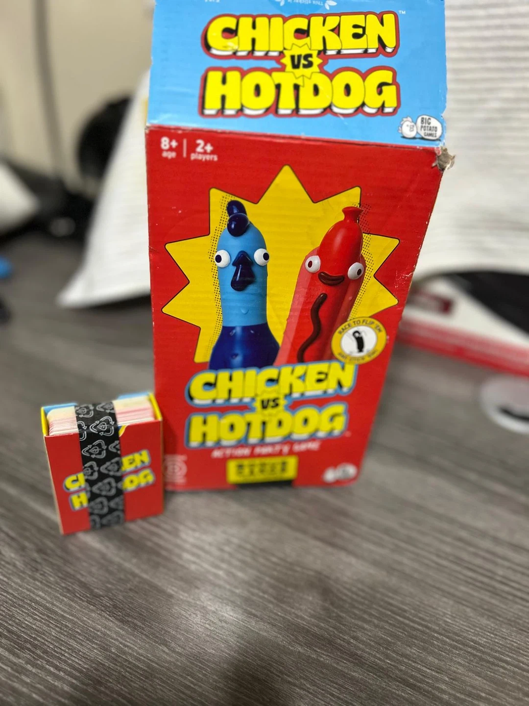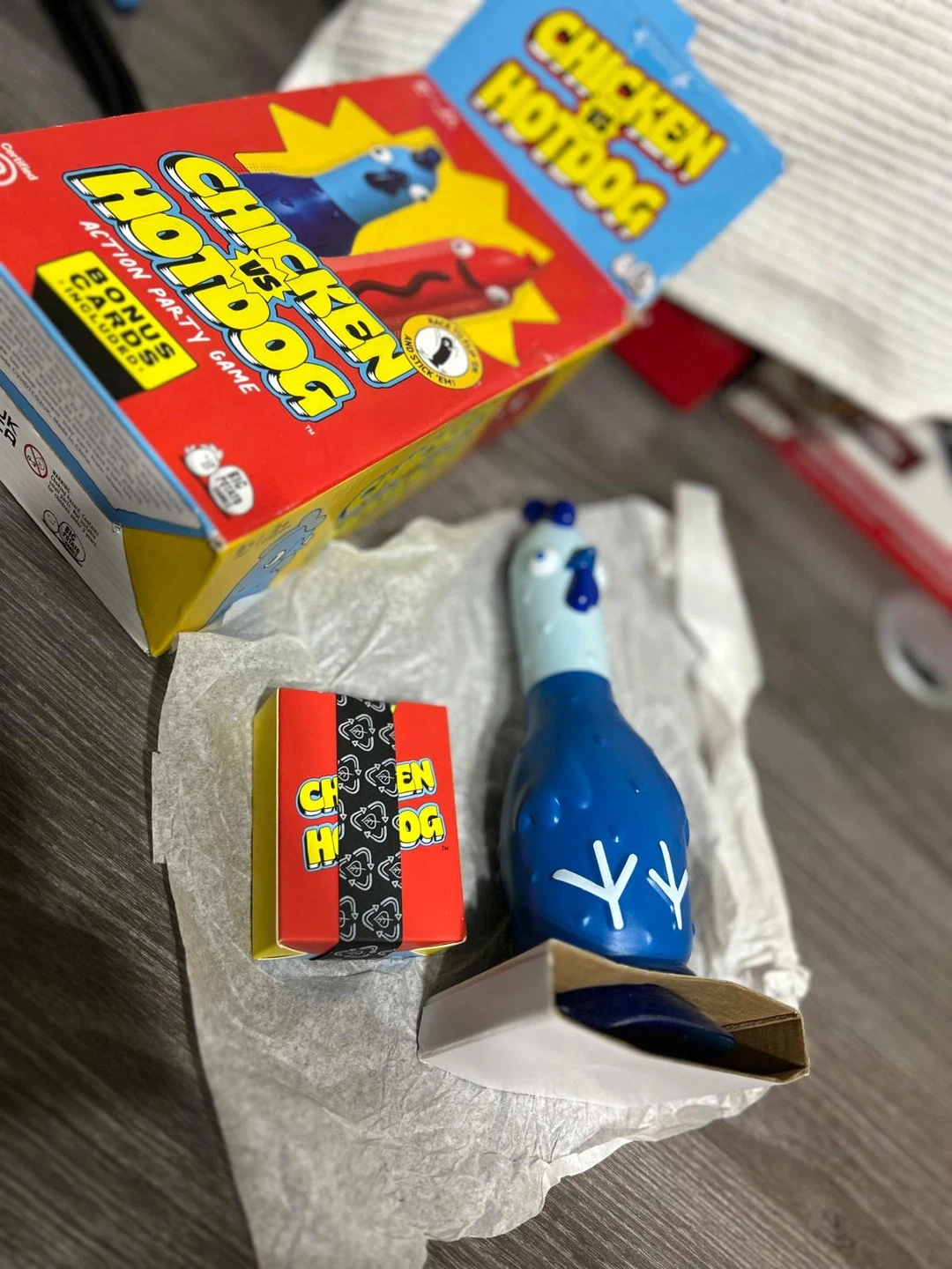 It's the new Chicken vs Hotdog board game, complete with the chicken figure and bonus cards. Great for family game nights with players aged 8 and up! Includes two or more players.