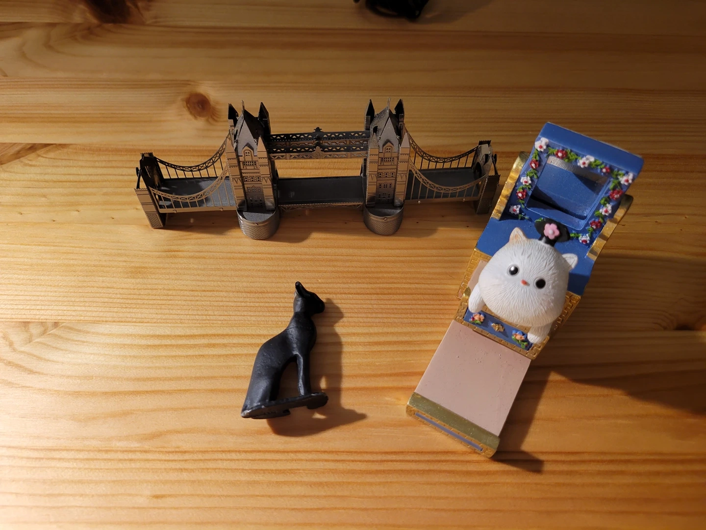 metal London bridge model, little Egyptian cat status from the British museum, and a cat phone holder from the Beijing forbidden city museum. Fun little objects to display!