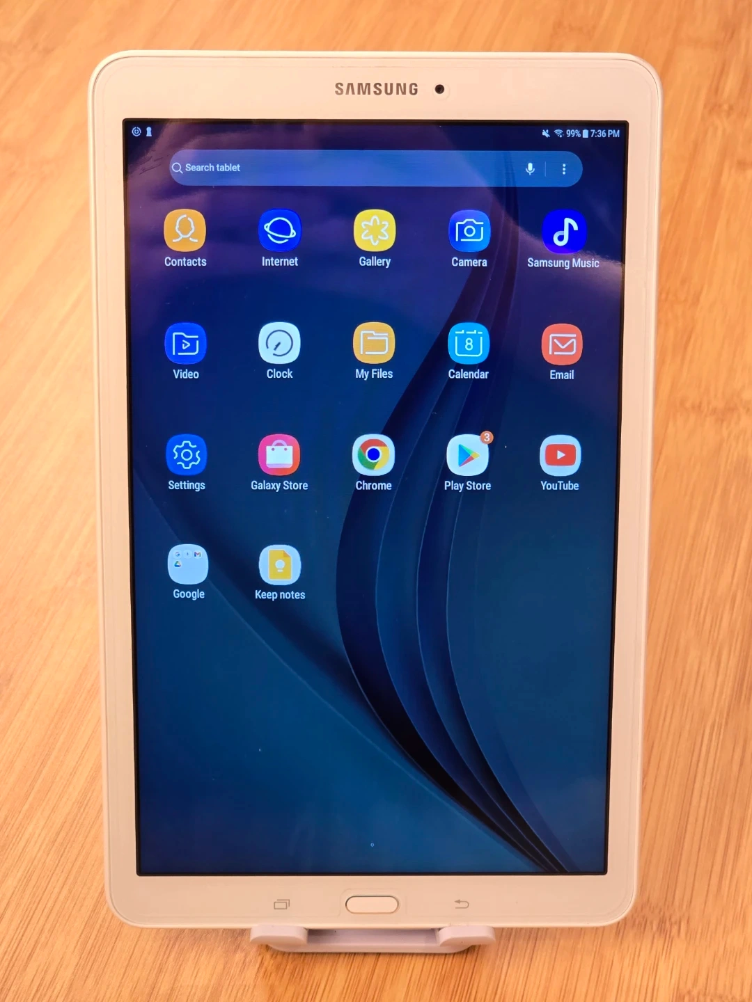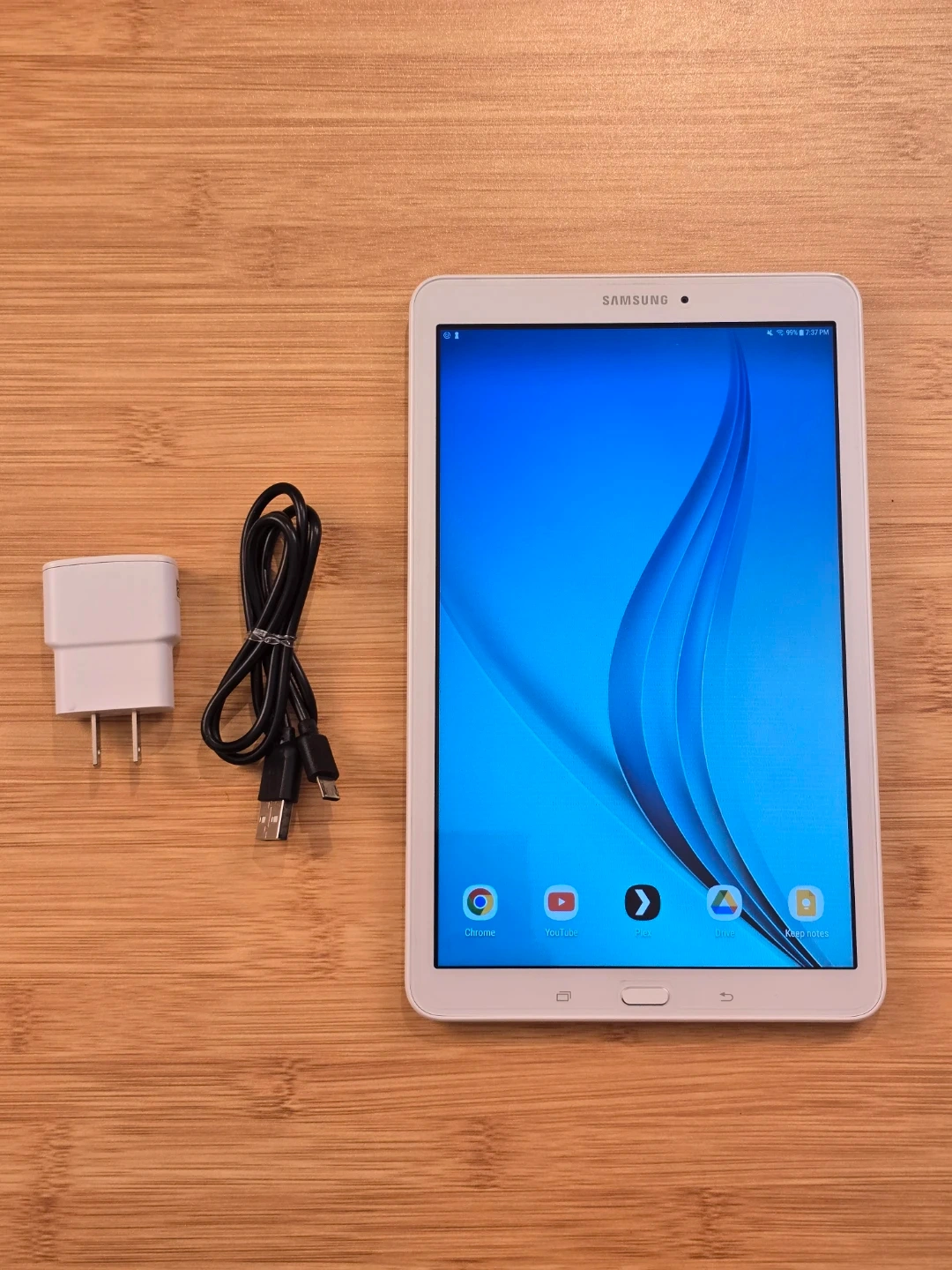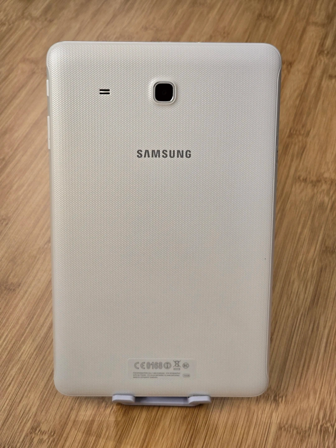 This is a white Samsung Galaxy Tab E Lite tablet. It has 16GB of storage and comes with its charger and USB cable. The battery capacity is 7300 mAh. Includes screen protector. Perfect condition.