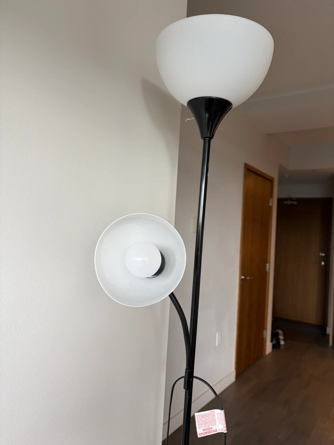 This is a black floor lamp featuring a main light and a flexible reading light. It's designed for easy placement in any room. The reading light can be adjusted to direct light where you need it most.