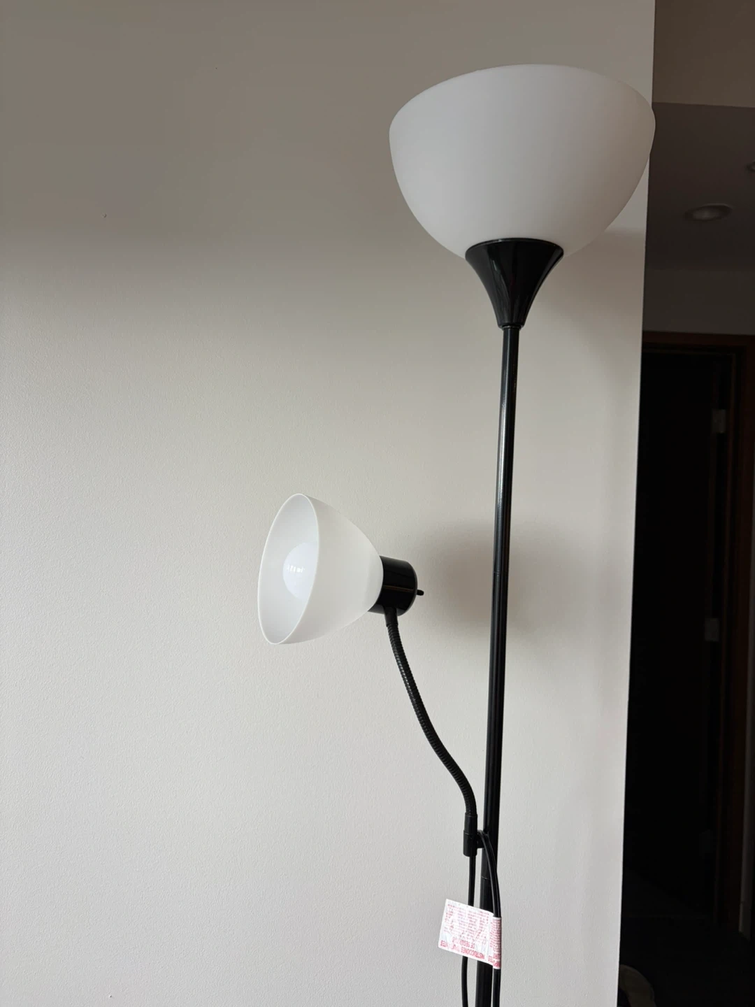 This is a black floor lamp featuring a main light and a flexible reading light. It's designed for easy placement in any room. The reading light can be adjusted to direct light where you need it most.