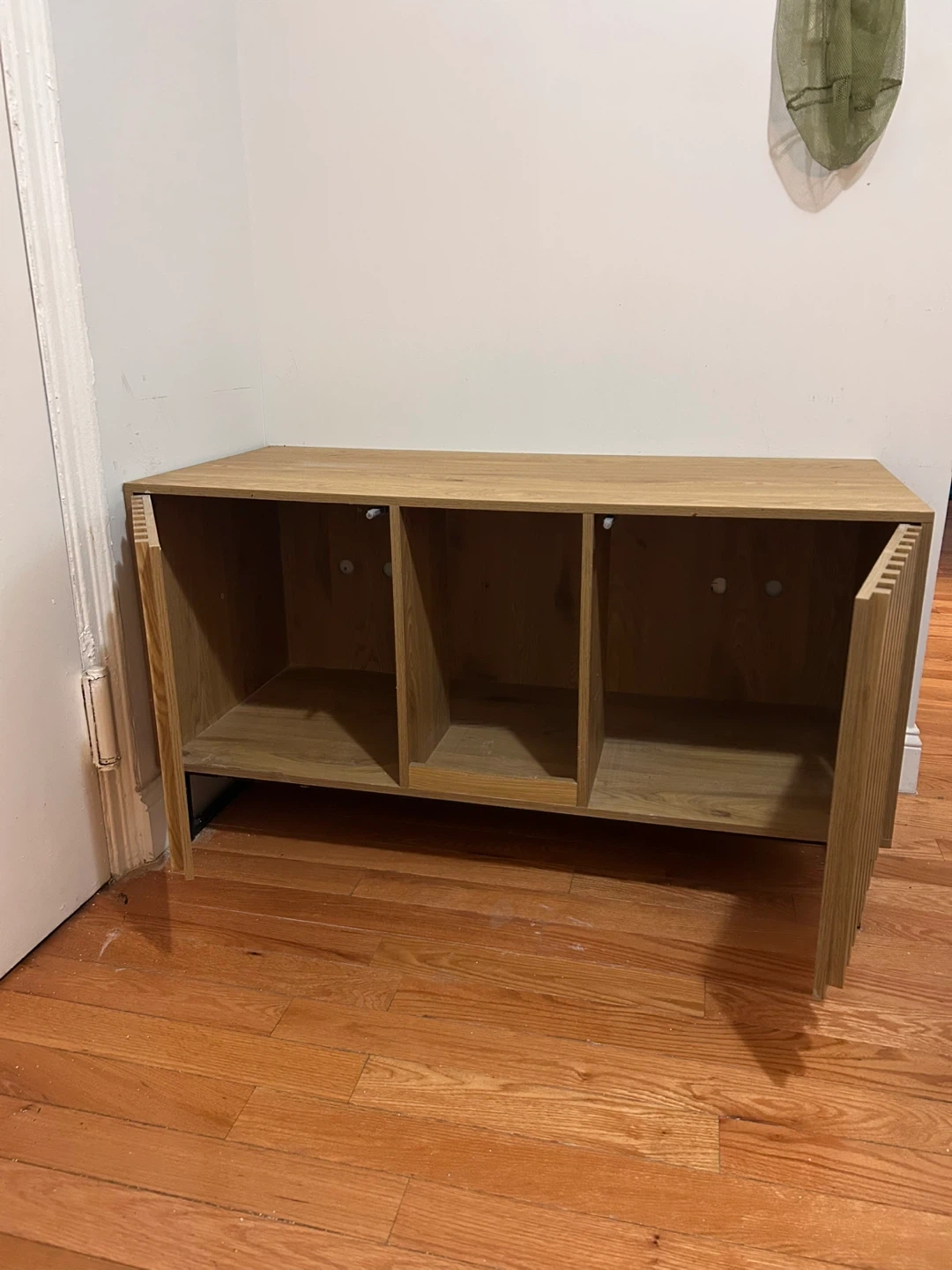 This cabinet is designed to conceal 2 litter boxes, offering a discreet solution for pet owners. It features three separate compartments, two with doors, and is made from a light-colored wood material. The design includes slatted doors and a modern, raised base.