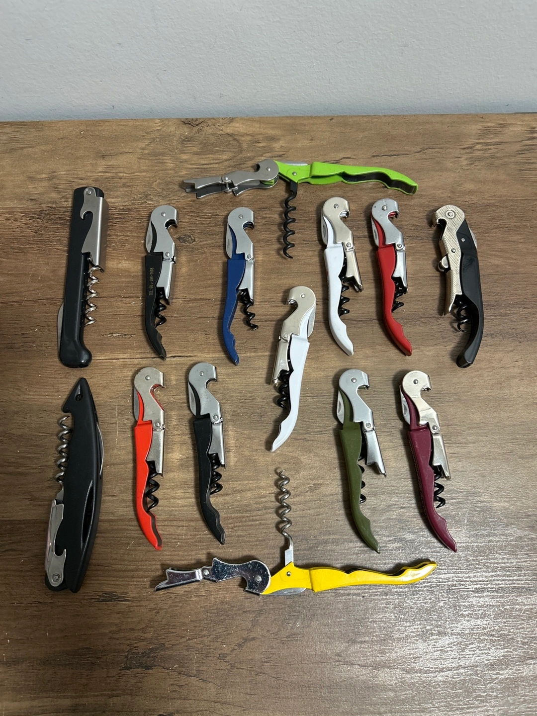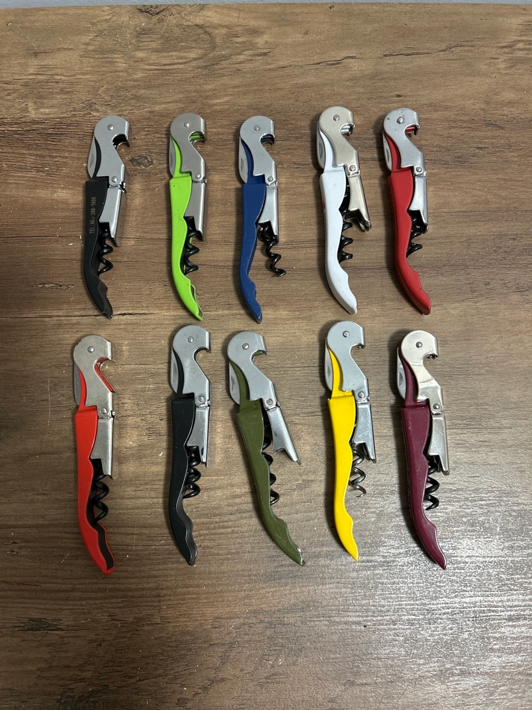 A collection of assorted corkscrews in various colours, including black, red, white, blue, green, yellow, and burgundy. These are winged corkscrews, a popular style for opening wine bottles. A great addition for any home bar or kitchen!