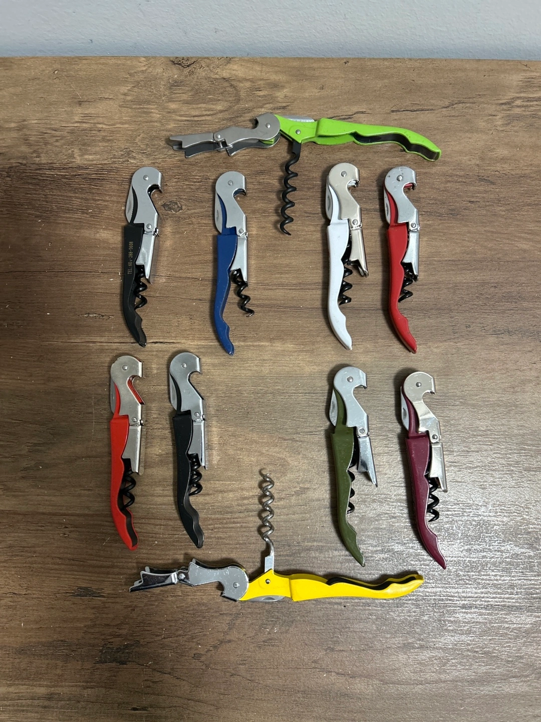 A collection of assorted corkscrews in various colours, including black, red, white, blue, green, yellow, and burgundy. These are winged corkscrews, a popular style for opening wine bottles. A great addition for any home bar or kitchen!