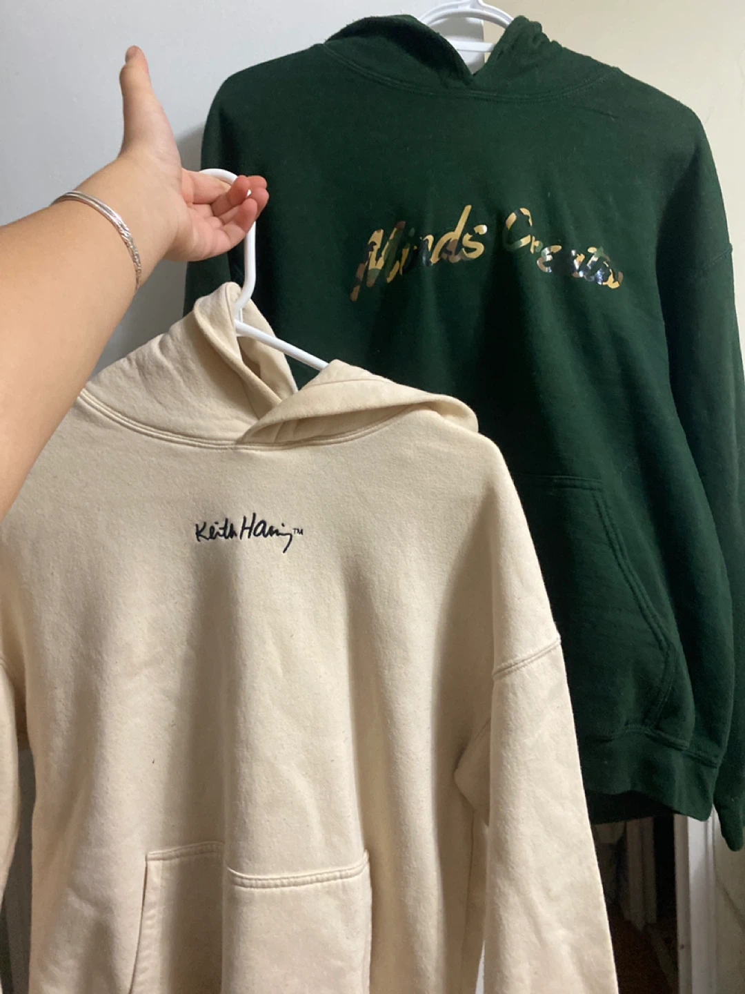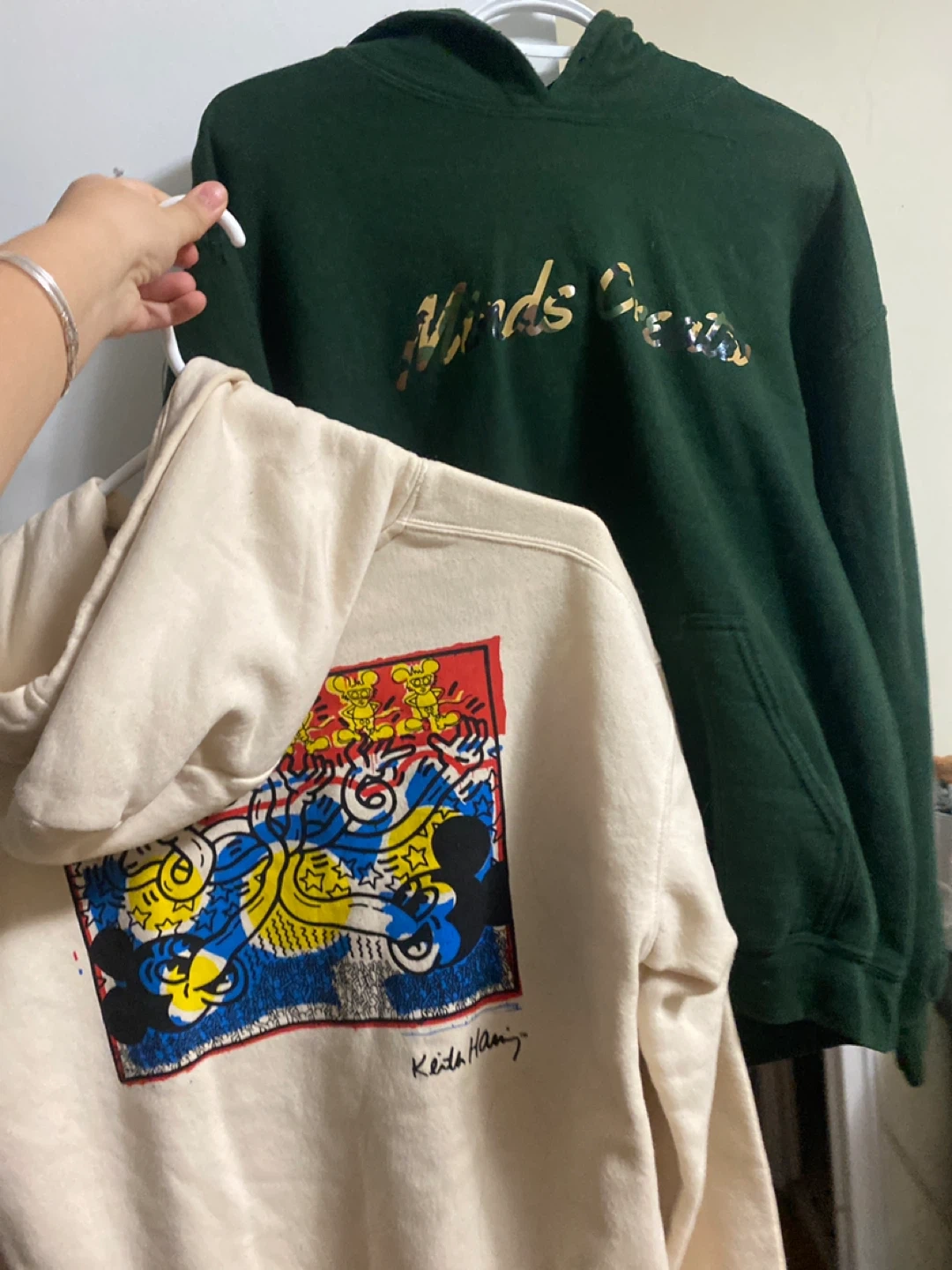Two hoodies featuring Keith Haring artwork and a Minds Desire graphic. The beige hoodie has a large colourful Keith Haring print on the back and "Keith Haring" on the front. The green hoodie has a "Minds Desire" graphic with a leopard print accent. Both are pullover style with hoods and front pockets.